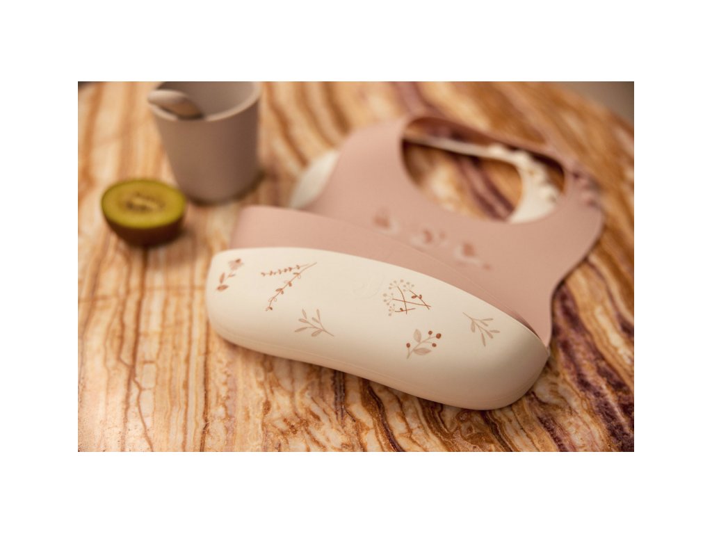 Bryndák z jemného silikonu s potiskem má širokou kapsu na zachycení drobečků a kapek. Je omyvatelný a lze jej mýt v myčce, ideální pro děti od 4 měsíců.