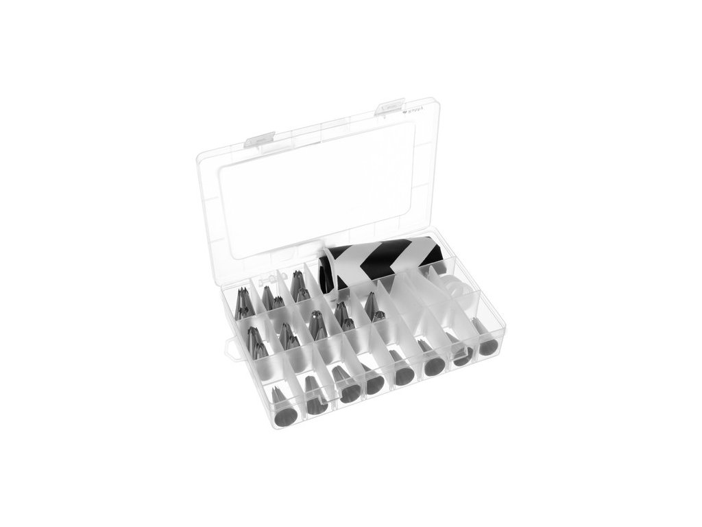 - Obsahuje 24 vyměnitelných nerezových hrotů, které umožňují vytvářet různé vzory na dortech a cupcakes.