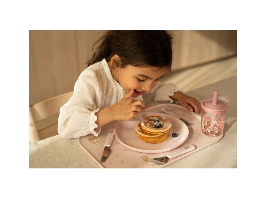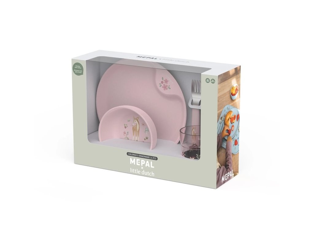 6-dílná jídelní sada v krásném designu s jemným potiskem obsahuje dětský talíř, misku, kelímek, lžíci, vidličku a nůž. Dětský talíř je vhodný pro samostatné stolování dítěte, díky praktickému úchytu se snadno přenáší. Miska je ideální pro servírování dětským zeleninových či ovocných příkrmů, polévek, kaší, ovoce apod. Talíř i miska jsou vyrobeny z lehkého, mimořádně odolného plastu. Kelímek z průhledného, odolného plastu je ideální pro děti, které se učí pít ze skleničky. Příbor z kvalitní nerezové oceli s plastovou rukojetí pro snadné držení usnadní dítěti přechod z krmení lžičkou na stolování s příborem. Sada je součástí designové kolekce hraček a doplňků pro děti Little Dutch Fairy Garden, inspirované životem na zahradě. Rozměry talíře: průměr 22 cm, výška 2 cm Miska: objem 300 ml Kelímek: objem 250 ml Rozměry příboru: vidlička / lžíce 14,5 cm, nůž 16,5 cm Všechny součásti sady je možné mýt v myčce. Zdravotně nezávadný materiál neobsahuje melamin ani BPA. Vhodné pro děti od 12 měsíců.
