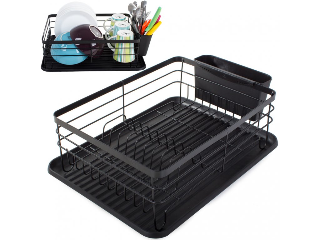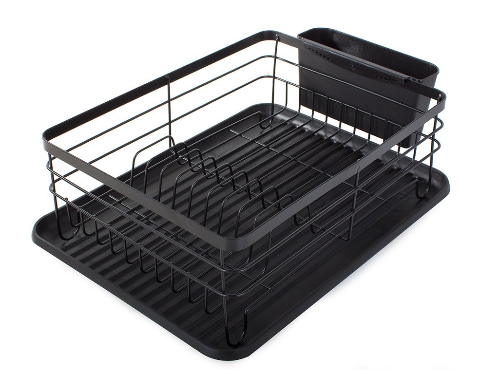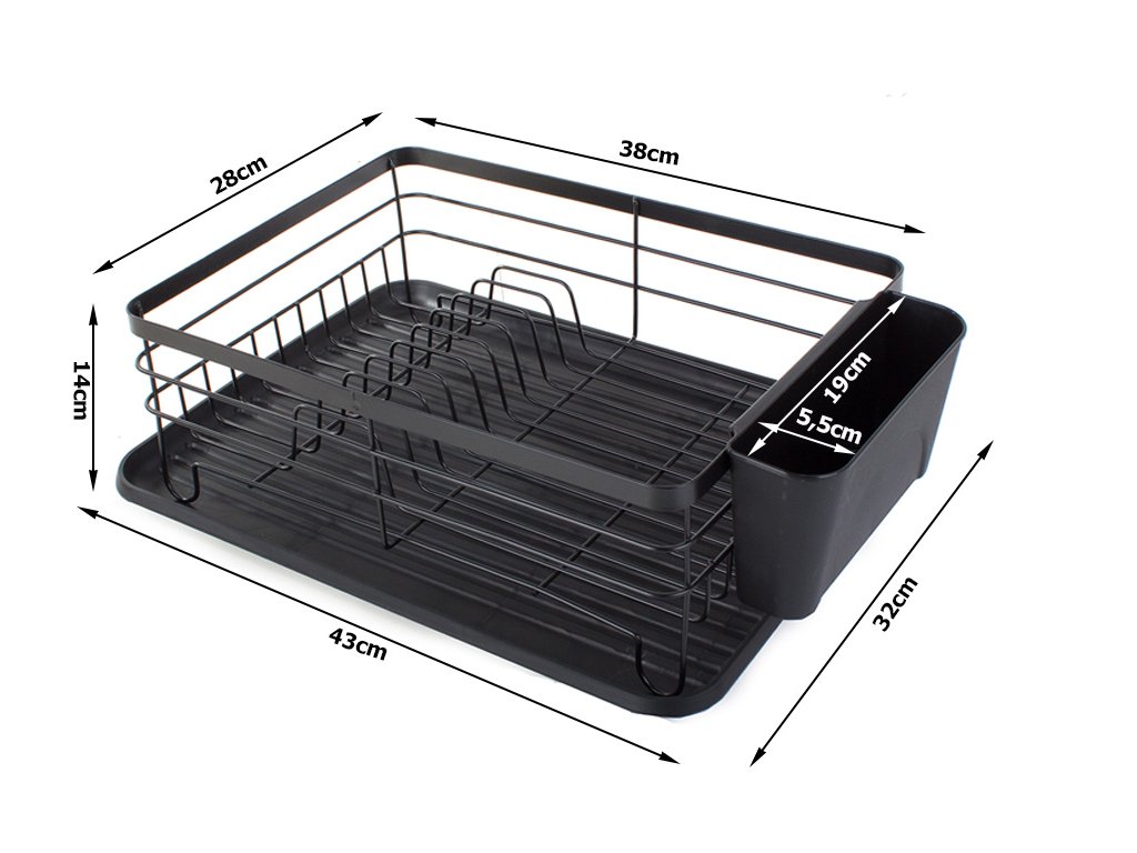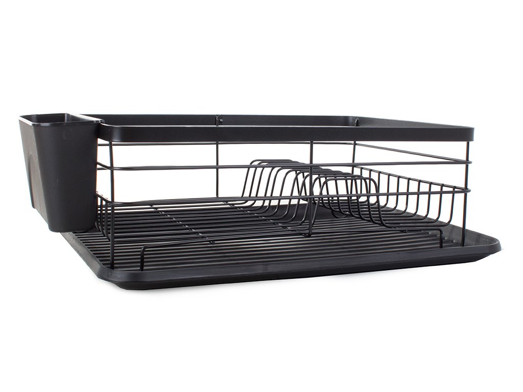 Kuchyňský odkapávač je vyroben z vysoce kvalitního práškově lakovaného kovu, což zajišťuje jeho odolnost vůči poškození a vlivům vlhkosti, které vznikají při ukládání mokrého nádobí.