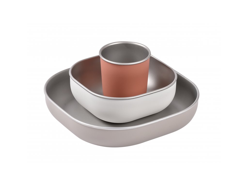 Jídelní sadu inovativního nerezového nádobí se silikonovou povrchovou vrstvou tvoří talíř, miska a kelímek. Ergonomický tvar s vysokými stranami a zaoblenými rohy jsou ideální pro učení dětí samostatnému stolování. Silikonový povrch nádobí pomáhá, aby nádobí neklouzalo na stole ani v ruce. Lehké a nerozbitné nádobí je vhodné do mikrovlnné trouby, klasické trouby (do 180°), myčky i lednice. Nerezová ocel je odolný materiál bez chemikálií, který neovlivňuje chuť ani vůni pokrmu. Vhodné pro děti od 4 měsíců.