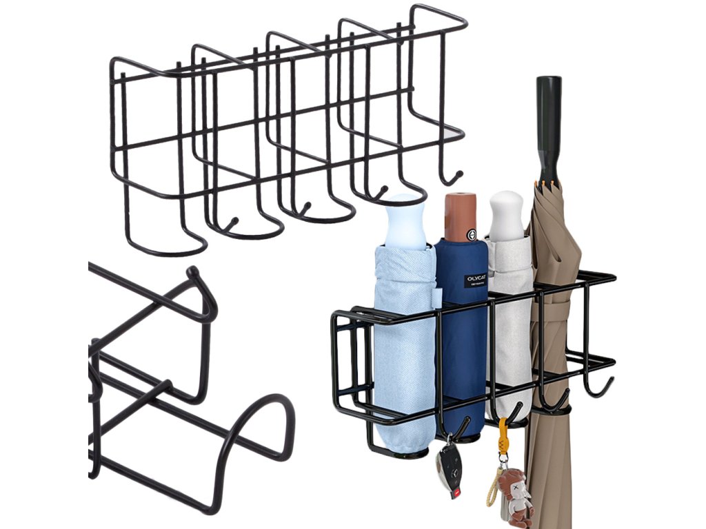 Představujeme vám funkční a stylový stojan na deštníky, ideální pro vaši domácnost, kancelář nebo obchod. Vlastnosti produktu: - Výroba z vysokokvalitního kovu, který zajišťuje odolnost a elegantní vzhled. - Držák pojme až 4 deštníky, jak dlouhé, tak složené. - Udržuje váš přední pokoj uklizený. Další funkce: - Výrobek je vybaven 4 háčky pro zavěšení klíčů, klíčenek nebo jiných drobných předmětů. - Obsahuje samolepicí háčky pro rychlé a snadné umístění na zeď bez nutnosti vrtání. - Samolepicí háčky zajišťují pevné a trvalé přilnutí k povrchu. - Kompaktní provedení, které nezabírá mnoho místa, ale nabízí dostatek úložného prostoru pro deštníky a další příslušenství.