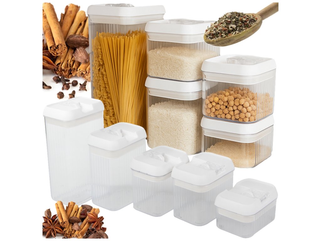 Sada 5 praktických kuchyňských nádob s hermetickým uzávěrem je ideálním řešením pro skladování těstovin, rýže, krupice, cereálií, kávy, čaje, sušenek nebo sladkostí. Díky těsným víčkům si produkty déle zachovávají čerstvost a aroma a jejich obsah je dobře chráněn před vlhkostí a hmyzem.