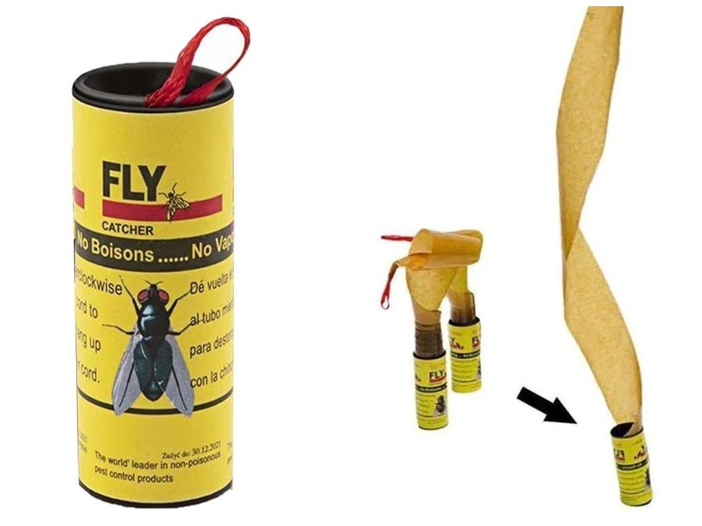 Použití: - Lepivý proužek je navinut na roli. - Před použitím otevřete krabici a pomalu vytáhněte lepivý proužek. - Na konci je závěs, na který můžete past pověsit. - Každá lepivá páska má navíc připevněný hřebík, kterým ji lze snadno připevnit na zeď nebo dřevěné prvky. - Past by neměla být zavěšena na přímém slunci. - Při rozvinutí funguje lepivý obal jako závaží, aby zabránil slepení pásky dohromady.