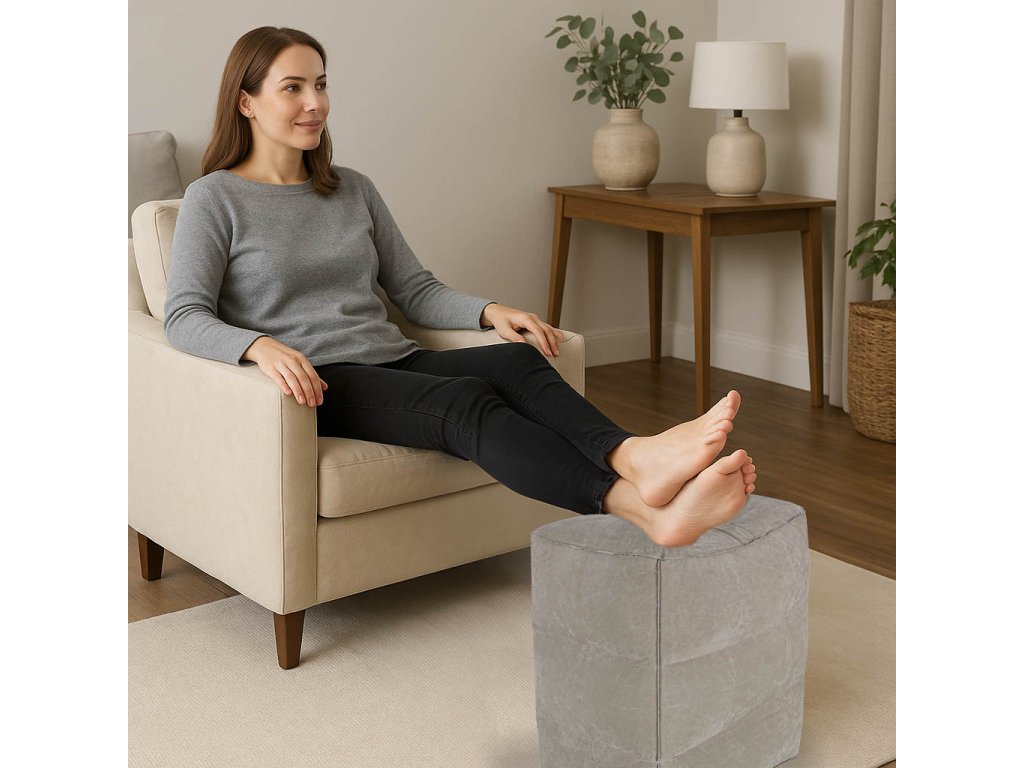Díky své lehké konstrukci lze nafukovací puf použít kdekoli: jako opěrku nohou, další sedátko nebo kompaktní kus nábytku, který si můžete vzít na cesty. Je to řešení, které spojuje mobilitu a pohodlí s elegancí.