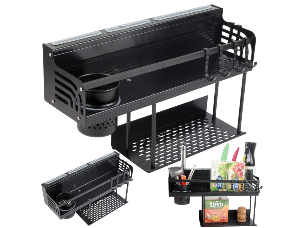 Organizér má dvě vodorovné police, držáky na kuchyňské náčiní a také nádobu na příbory nebo houbičky, díky čemuž se skvěle hodí jak nad dřez, tak vedle sporáku. Díky perforovanému dnu může voda volně odtékat, což udržuje příslušenství čisté a suché. Police lze připevnit na zeď nebo postavit na pracovní desku, podle potřeby a dostupného místa.