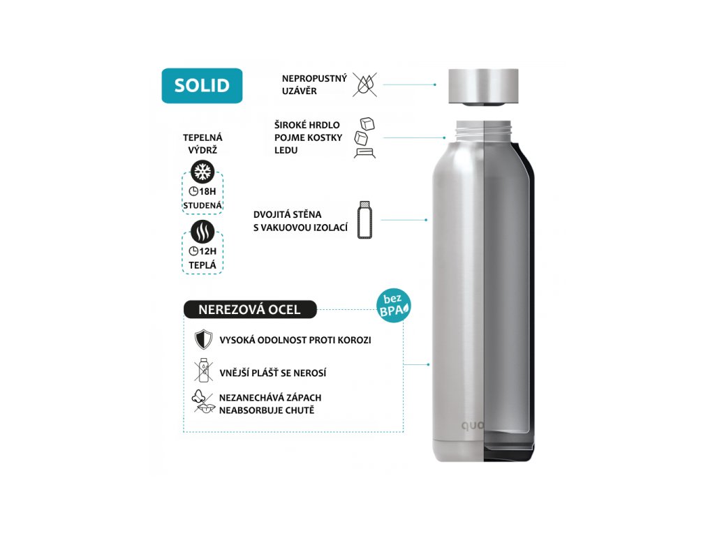 Termoska Quokka Solid z vysoce kvalitní dvoustěnné oceli se spolehlivým, 100% těsnicím uzávěrem udrží váš nápoj dle potřeby teplý či studený. Široké hrdlo umožňuje vložení kostek ledu. Termoska udrží teplotu studeného nápoje s ledem až 48 hodin, studeného nápoje až 18 hodin a teplého nápoje až 12 hodin. Objem: 630 ml Rozměry: 250 x 72 mm Hmotnost: 299 g Nerezový materiál neabsorbuje pachy a neobsahuje BPA. Termoska není vhodná do myčky ani mikrovlnné trouby.