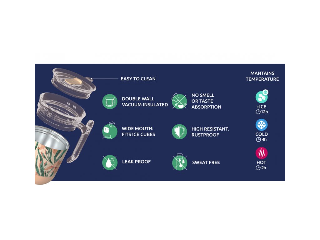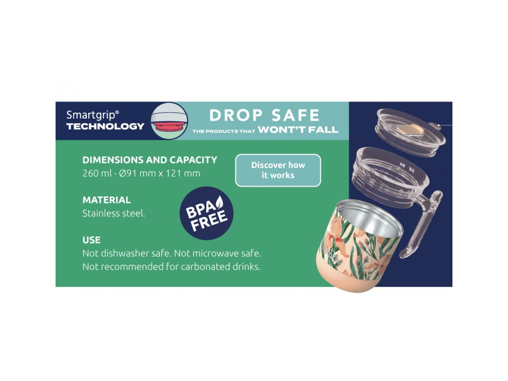 Termohrnek Quokka Wave z vysoce kvalitní dvoustěnné oceli se spolehlivým, 100% těsnicím uzávěrem udrží váš nápoj dle potřeby teplý či studený. Termohrnek udrží teplotu studeného nápoje s ledem až 12 hodin, studeného nápoje až 4 hodiny a teplého nápoje až 2 hodiny. Quokka Wave je součástí kolekce hrnků Drop Safe se speciálním dnem Smartgrip®, které při postavení na hladký povrch brání převržení a nechtěnému vylití obsahu hrnku. Široké hrdlo umožňuje vložení kostek ledu. Víčko se zaklapávacím uzávěrem umožňuje snadné pití přímo z hrnku. Objem: 260 ml Rozměry: 121 x 91 mm Nerezový materiál neabsorbuje pachy a neobsahuje BPA. Termohrnek není vhodný do myčky ani mikrovlnné trouby.