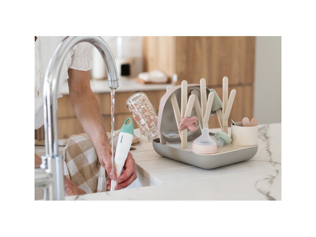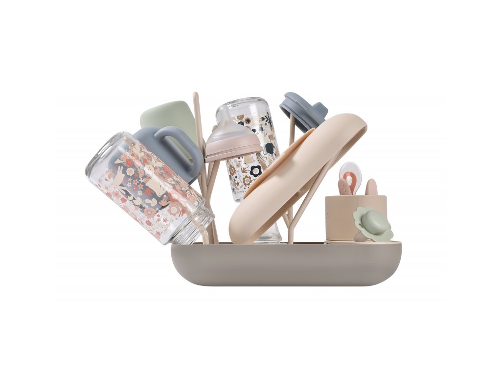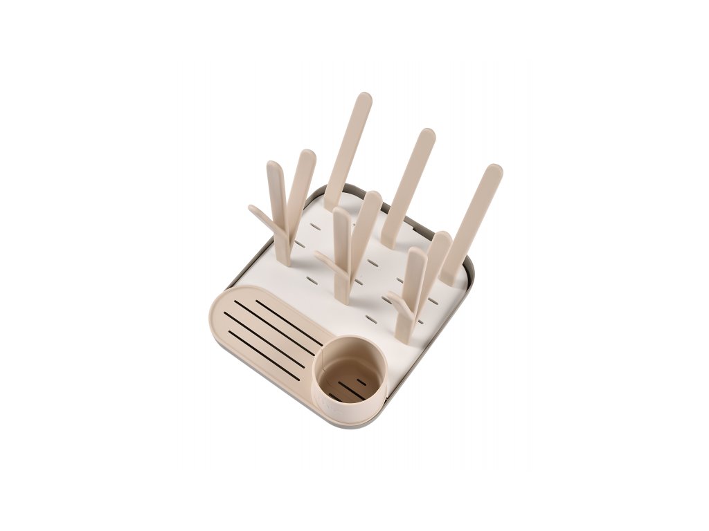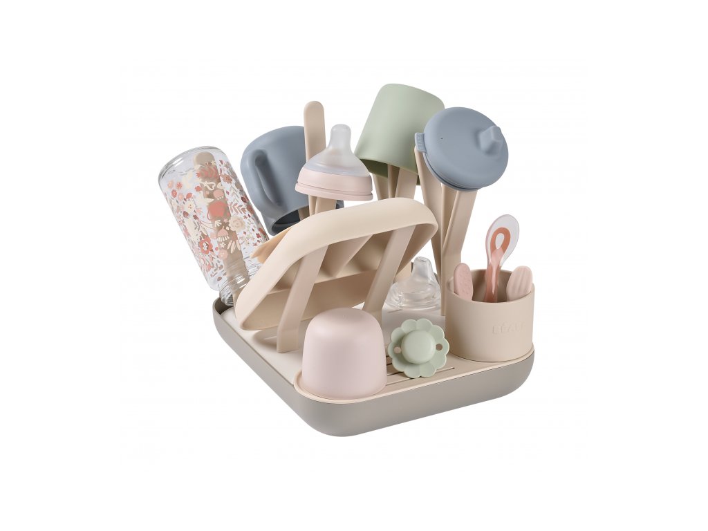 Variabilní stojan Beaba na sušení kojeneckých lahví, hrnků, misek, lžiček a doplňků. Stojan má vyjímatelné držáky a umožňuje tak přizpůsobit jeho uspořádání dle typu a velikosti nádobí, které na stojan potřebujete umístit. Odnímatelná základna usnadňuje údržbu stojanu a zároveň slouží pro uložení jednotlivých součástí stojanu, když jej právě nepoužíváte. Stojan má kapacitu až 6 kojeneckých lahví a jejich příslušenství. Variabilní uspořádání umožňuje jeho použití pro jakékoli dětské nádobí.