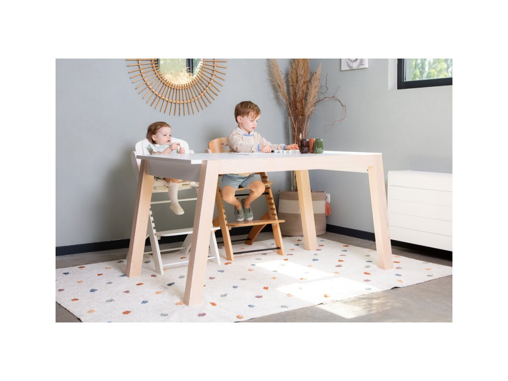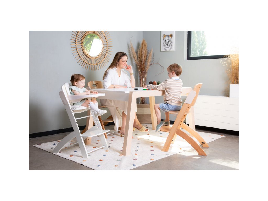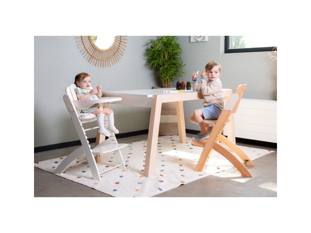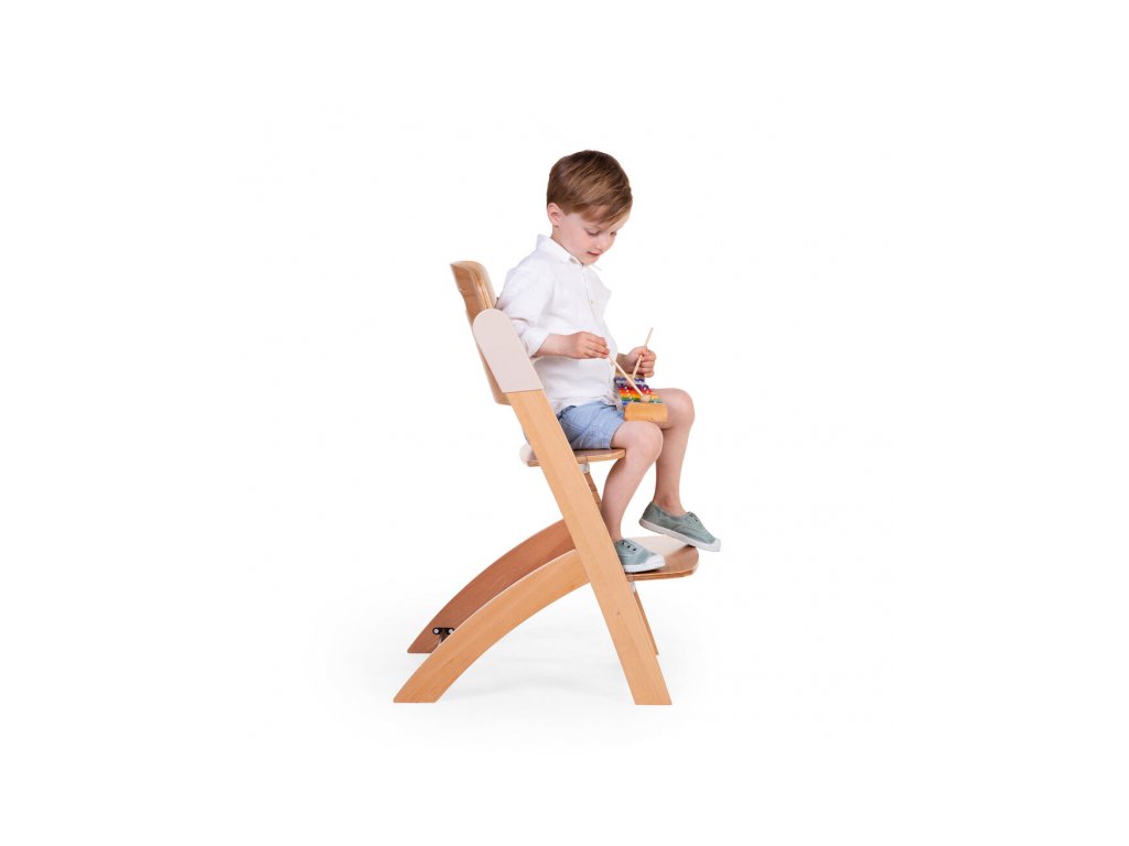 Rostoucí židlička z bukového dřeva Childhome Evosit umožňuje snadné nastavení výšky sedáku a opěrky nohou bez šroubování. Díky svému nadčasovému designu se židlička stane i krásným doplňkem vašeho interiéru. Odnímatelný jídelní pult z ABS plastu se snadno udržuje otřením a je možné jej mýt myčce. Bezpečné usazení dítěte zajišťuje 5-bodový bezpečnostní pás a madlo kolem pasu. Pro starší děti je možné madlo i pásy odmontovat a židličku používat jako standardní židli ke stolu. Díky nosnosti do 85 kg je možné židličku používat až do dospělosti dítěte. Pro větší pohodlí dítěte je možné k židličce dokoupit sedací polštářky. Rozměry jídelního pultu: Š 36 cm - H 17 cm Výška pultu od země: 72,5 cm Rozměry sedáku: Š 43 cm - H 23 cm Možné výšky sedáku: 56 cm - 52,5 cm - 49 cm Rozměry opěrky nohou: Š 43cm - H 26cm Možné výšky opěrky nohou: 41, 37, 33.5, 29.5 a 26 cm Půdorys židličky: 45 x 60 cm Rozměry: 45 x 53 x 86 cm Nosnost: 85 kg Vhodné pro děti od 6 měsíců.
