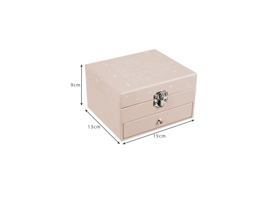 - Pastelově růžová krabička je vyrobena z odolného kartonu a je zdobena motivem jednorožce a jemnými bílými hvězdami.