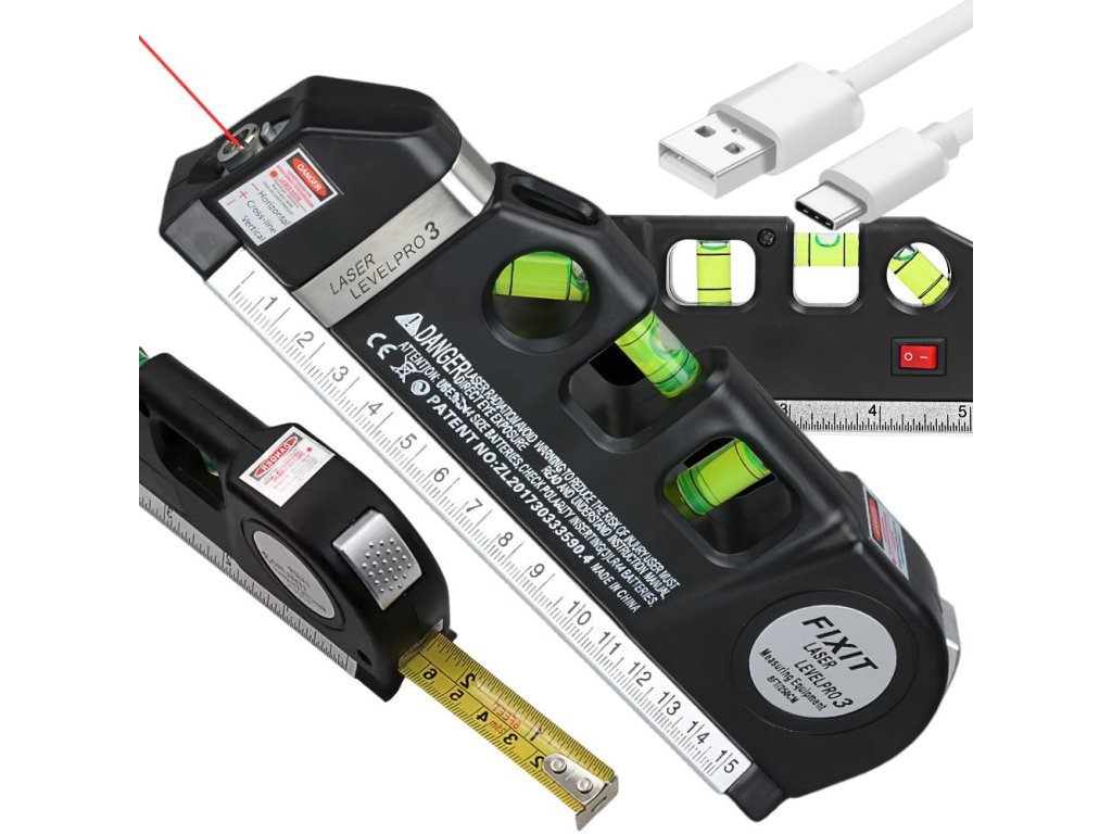 Přesná laserová vodováha s dálkoměrem 2,5 m, 3 LED režimy a USB nabíjením