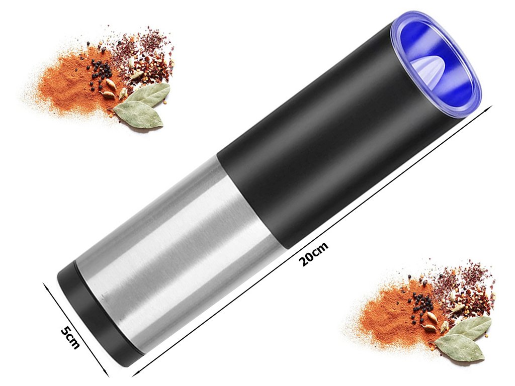 Popis produktu: Elektrický mlýnek na koření je vyroben z vysoce kvalitních materiálů. Díky pečlivému zpracování uspokojí každého uživatele. Je to perfektní tip na dárek. Jednoduché ovládání: Mlýnek je velmi snadno ovladatelný, stačí ho naklonit pod úhlem přibližně 45 stupňů a automaticky začne mlít. Klíčové vlastnosti: - Vestavěné osvětlení - Průhledný zásobník s kapacitou přibližně 85 ml - Nastavitelná kontrola mletí - jednoduše otočte koncem mlýnku doleva nebo doprava pro volbu požadované tloušťky mletého zrna - Modré LED podsvícení, které se aktivuje při naklonění pro mletíTECHNICKÉ SPECIFIKACE: