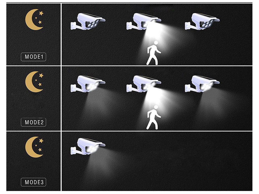 - Režim 2: LED diody svítí na 50 % svého výkonu po celou dobu, při detekci pohybu se přepnou na 100 % výkonu. Po zastavení pohybu se kamera vrací do pohotovostního režimu a svítí na 50 % výkonu. Automatické zapínání při soumraku a vypínání při úsvitu.