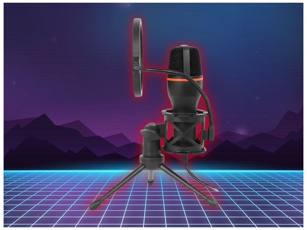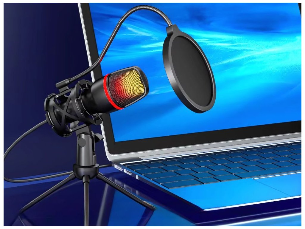 Integrované podsvícení RGB dodává moderní nádech a vypadá skvěle na každém stole. Mikrofon je upevněn na pružném nárazovém držáku, který tlumí vibrace. Stativ se třemi protiskluzovými nožičkami zajišťuje stabilitu a pohodlné používání. Přiložený pop filtr účinně eliminuje výbušné zvuky "P" a "B", čímž zvyšuje komfort nahrávání.