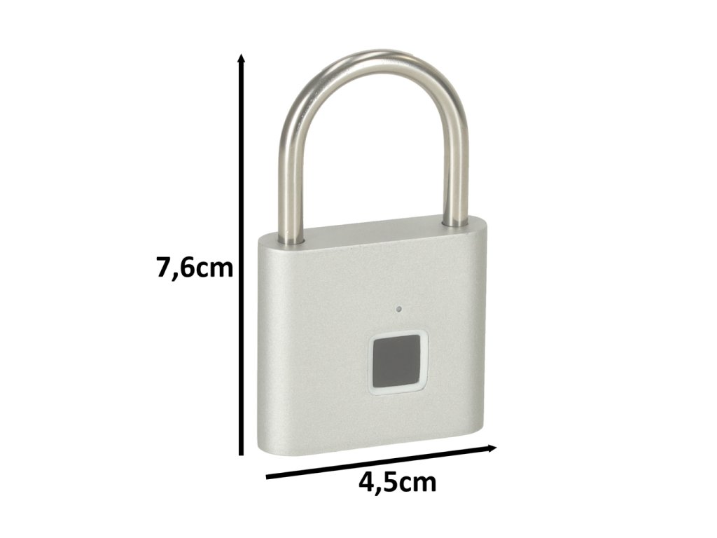 Materiál: Zinek, ocel Voděodolnost: IP56 Napájení: Vestavěná baterie 3,7 V Maximální počet uložených otisků prstů: 10 Provozní teplota: -10 až 40 stupňů Celsia Rozměry visacího zámku: 7,6 cm x 4,5 cm x 1,2 cm Tloušťka zámku: 0,5 cm Rozměry balení: 10,5 cm x 7,6 cm x 1,8 cm Typ balení: Kartonová krabice