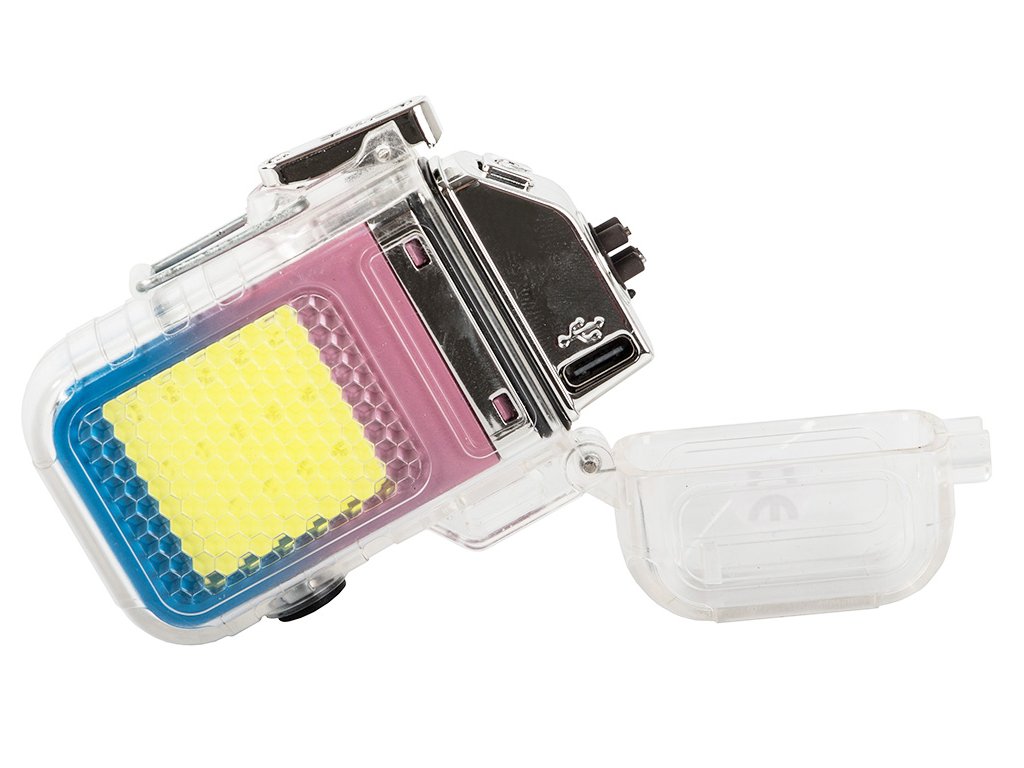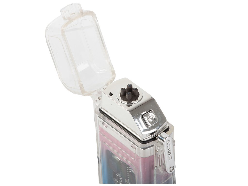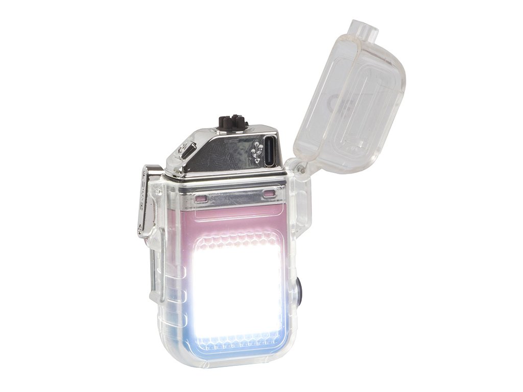 - Vodotěsnost: Konstrukce zapalovače zahrnuje těsnění, gumové tlačítko pro zapnutí baterky a těsnící uzávěr - klip. Podmínkou vodotěsnosti je, že musí být zařízení těsně uzavřeno, což chrání proti poškození při pádu do mělké vody.