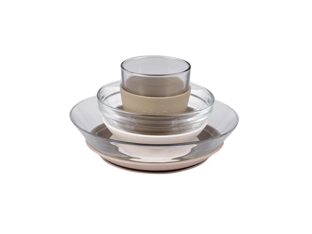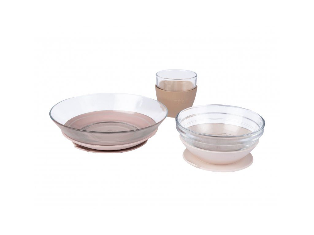 Unikátní sadu nádobí z tvrzeného skla tvoří jídelní miska, talířek a sklenička ergonomického, zaobleného tvaru s hladkými hranami. Miska a talíř jsou doplněny speciálními odnímatelnými podložkami z pružného materiálu s přísavkou, která zajišťuje stabilitu misky či talíře na stole a usnadňuje dítěti stolování. Návlek na skleničku ze stejného materiálu usnadňuje dítěti uchopení skleničky a snižuje riziko jejího vyklouznutí z ruky. Tvrzené sklo je 100% hygienický materiál odolný vůči poškrábání, nárazům a vysokým teplotám. V případě rozbití nedojde k vytvoření ostrých střepů. Sada nádobí je výsledkem spolupráce dvou francouzských značek - Beaba a Duralex. Ikonická značka Duralex je od roku 1945 průkopníkem ve výrobě tvrzeného skla. Nádobí je vyrobeno ve Francii. Nádobí bez odnímatelných podložek lze ohřívat v mikrovlnné troubě i mýt v myčce. Podložky je možné mýt ručně. Rozměry a hmotnost: Talíř: ø 17,5 cm x v 4,3 cm, 337 g Miska: ø 12 cm x v 5,3 cm, 300 ml, 243 g Sklenice: ø 7,1 cm x v 7 cm, 150 ml, 156 g Vhodné pro děti od 4 měsíců.Doplňkové parametry