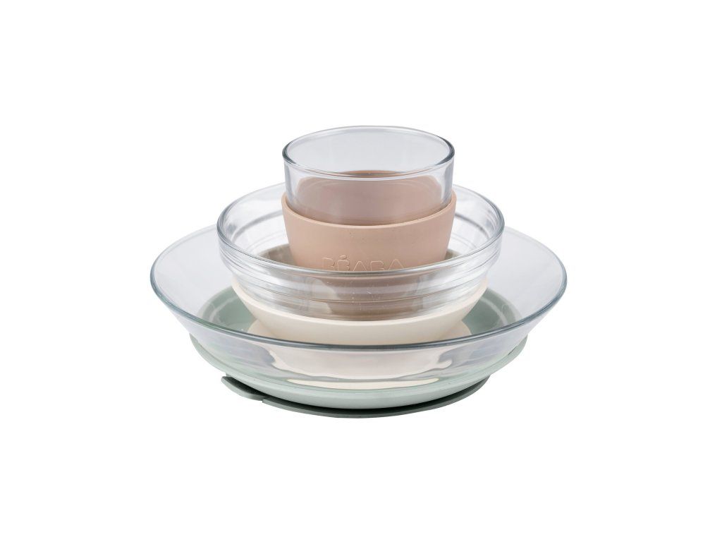 Unikátní sadu nádobí z tvrzeného skla tvoří jídelní miska, talířek a sklenička ergonomického, zaobleného tvaru s hladkými hranami. Miska a talíř jsou doplněny speciálními odnímatelnými podložkami z pružného materiálu s přísavkou, která zajišťuje stabilitu misky či talíře na stole a usnadňuje dítěti stolování. Návlek na skleničku ze stejného materiálu usnadňuje dítěti uchopení skleničky a snižuje riziko jejího vyklouznutí z ruky. Tvrzené sklo je 100% hygienický materiál odolný vůči poškrábání, nárazům a vysokým teplotám. V případě rozbití nedojde k vytvoření ostrých střepů. Sada nádobí je výsledkem spolupráce dvou francouzských značek - Beaba a Duralex. Ikonická značka Duralex je od roku 1945 průkopníkem ve výrobě tvrzeného skla. Nádobí je vyrobeno ve Francii. Nádobí bez odnímatelných podložek lze ohřívat v mikrovlnné troubě i mýt v myčce. Podložky je možné mýt ručně. Rozměry a hmotnost: Talíř: ø 17,5 cm x v 4,3 cm, 337 g Miska: ø 12 cm x v 5,3 cm, 300 ml, 243 g Sklenice: ø 7,1 cm x v 7 cm, 150 ml, 156 g Vhodné pro děti od 4 měsíců.Doplňkové parametry