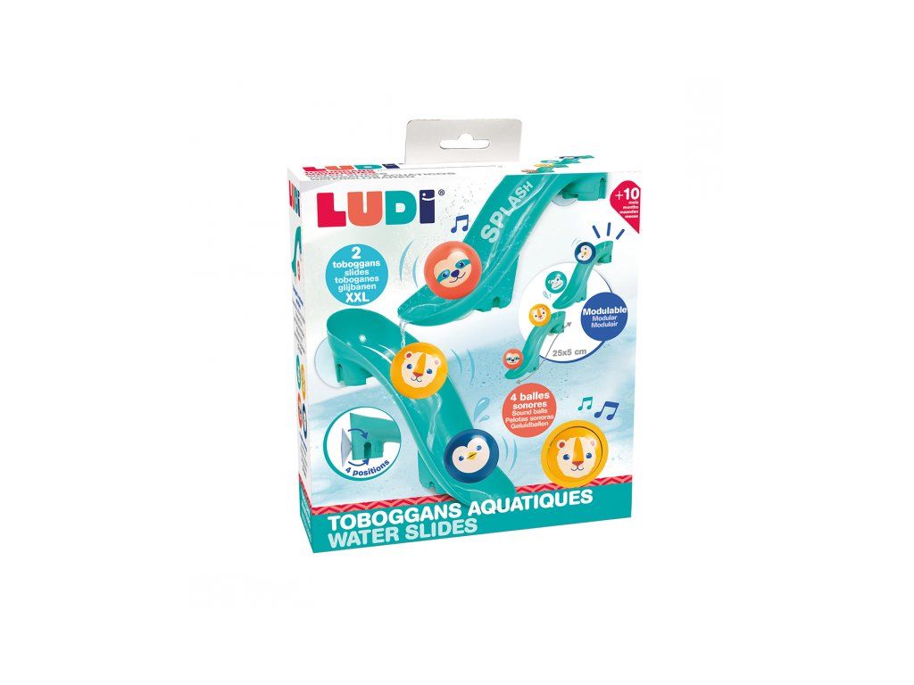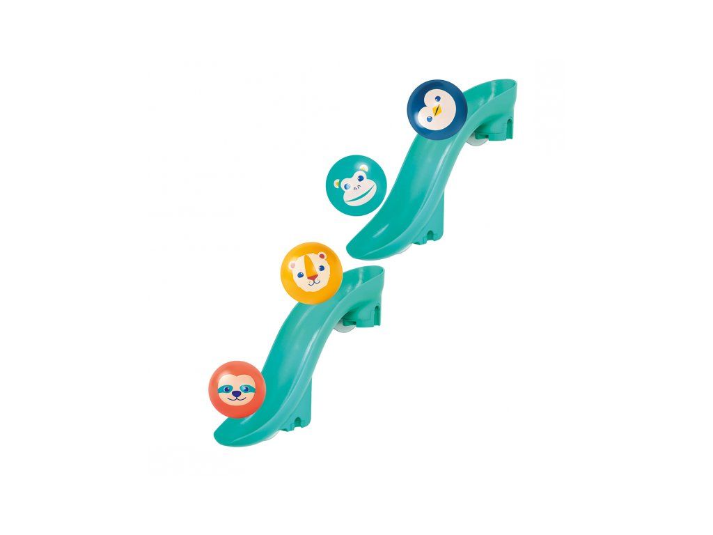 Tobogány s míčky do vany promění každé koupání v zábavnou vodní dráhu, kterou si dítě může samo sestavit a měnit. Díky silným přísavkám se jednotlivé díly snadno upevní na hladké povrchy (obklady, vanu) a drží stabilně i během hry. Dítě pozoruje, jak se míčky pohybují po dráze, zkouší různé varianty a postupně chápe princip příčina–následek. Čtyři plovoucí míčky s rolničkou při jízdě po skluzavce jemně cinkají a podněcují další objevování. 2 skluzavky s možností umístění ve 4 různých variantách silné přísavky pro stabilní uchycení na hladké povrchy 4 plovoucí míčky s rolničkou cinkající při pohybu podporuje jemnou motoriku, koordinaci i smyslové vnímání Rozměry: skluzavky 25 x 5 cm, míčky průměr 4,5 cm Složení: skluzavky PVC, míčky ABS Vhodné pro děti od 10 měsíců.Doplňkové parametry