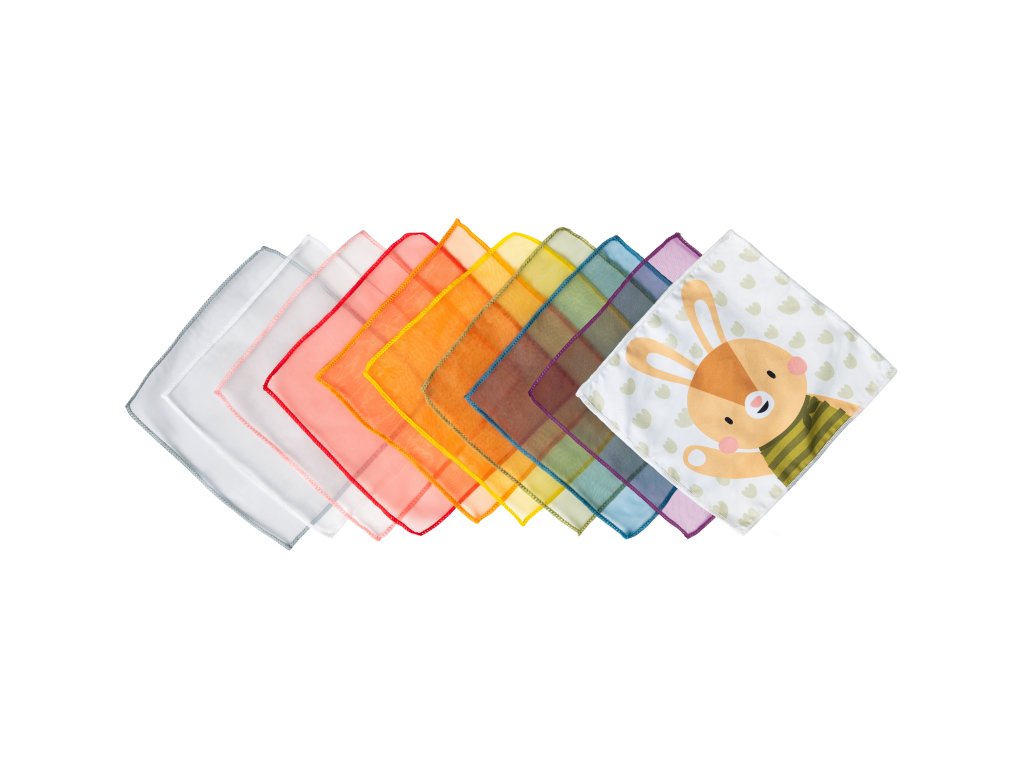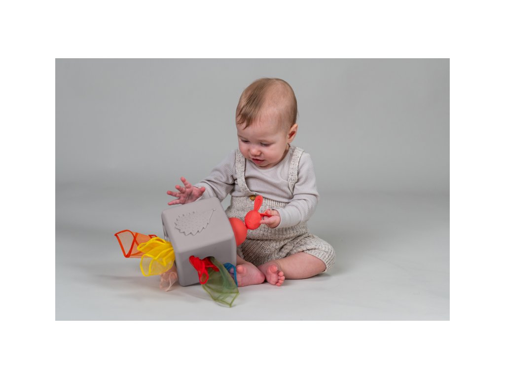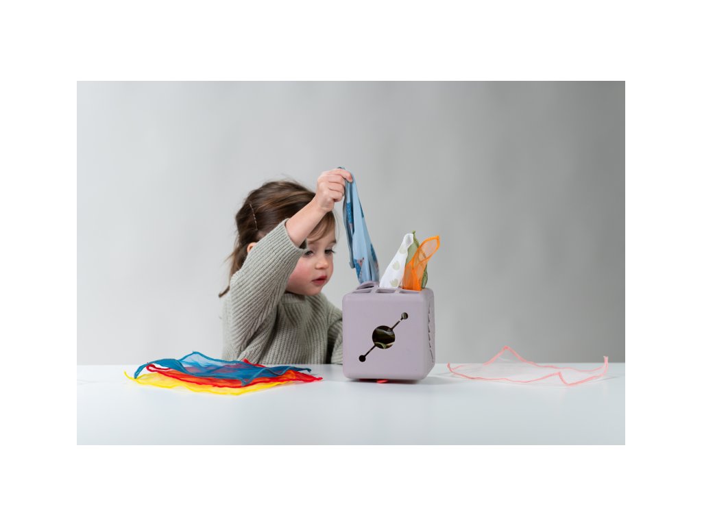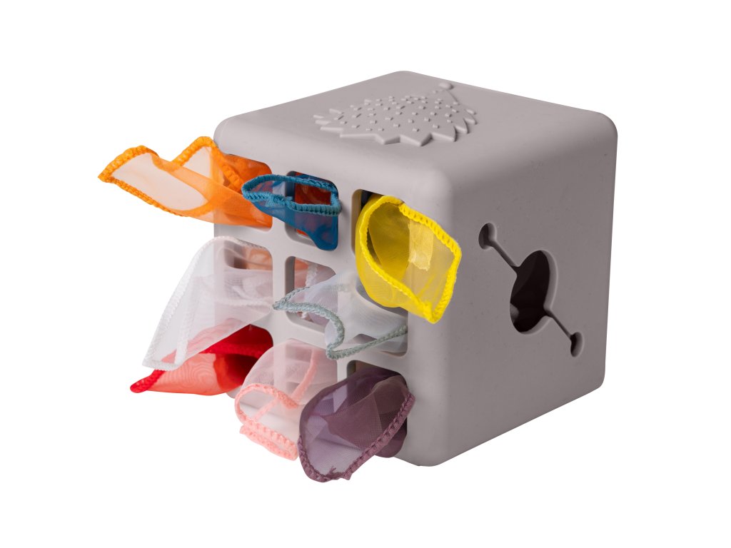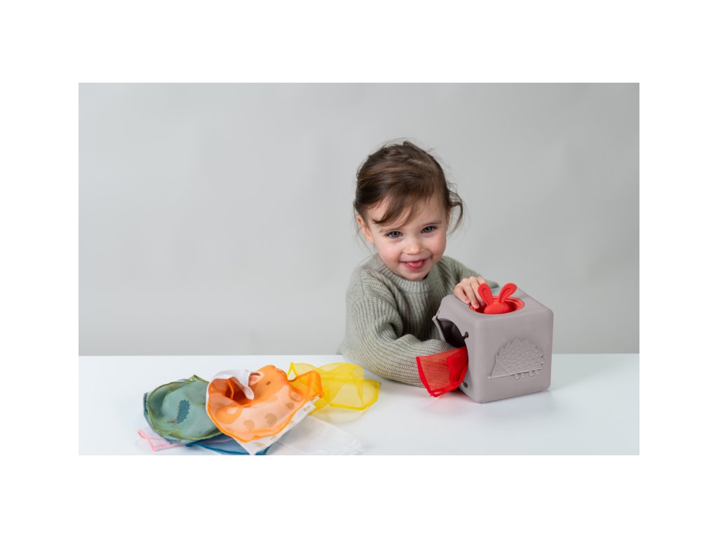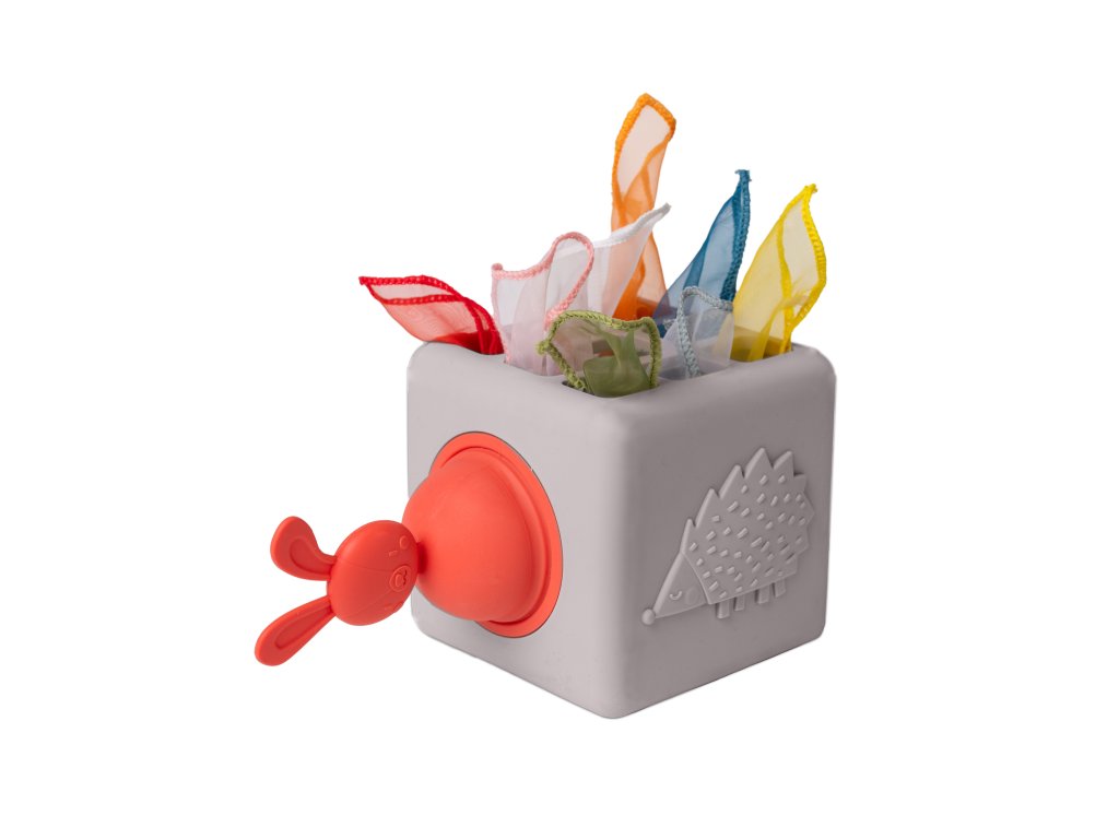 Originální hračka v podobě boxu s vytahovacími šátky a vyskakovacím králíčkem dítě zabaví a současně rozvíjí jeho jemnou motoriku a jednotlivé smysly. Box naplněný textilními šátky zajistí vašemu dítěti zábavu na dlouhé hodiny a zároveň podpoří rozvoj jeho smyslů i jemné motoriky. Dítě může šátky z boxu vytahovat a znovu je do něj vkládat, zkoumat jejich textury, ve starším věku pak poznávat jejich barvy, počítat je apod. Box vyrobený z jemného silikonu nabízí různé typy otvorů pro vytahování šátků, vyskakovacího králíčka a 3-D motivy ježka a květiny. Box obsahuje 10 šátků: 9 šátků různých barev z jemné organzy a 1 šátek s potiskem králíčka. Rozměry: 13,5 x 13,5 x 13,5 cm Vhodné pro děti od 12 měsíců.