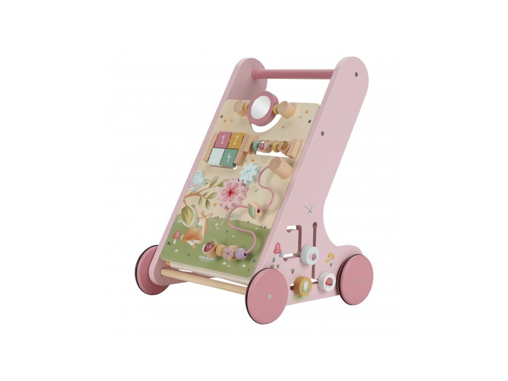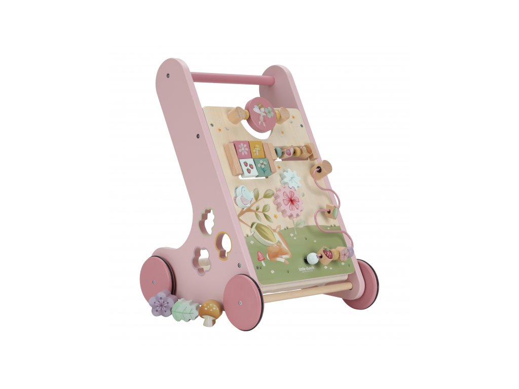 Dřevěné multifunkční chodítko se stabilní konstrukcí je ideální pro trénování chůze dětí od 12 měsíců, které jsou téměř připraveny učinit první kroky. Užijte si společně radostné okamžiky, když vaše dítě poprvé přejde celou místnost! Chodítko zároveň nabízí řadu zajímavých aktivit pro zkoumání a pozorování. Pohyblivé a otáčivé části s s krásnými ilustracemi motivů ze života na zahradě dítě zabaví a zároveň podporují rozvoj jeho motorických dovedností. Gumová kolečka nebudou dělat žádné stopy na podlaze a jsou bezpečná pro použití v interiéru. Chodítko je součástí designové kolekce hraček a doplňků Little Dutch Fairy Garden inspirované životem na zahradě. Vyrobeno z dřeva certifikovaného FSC. Rozměry: 32,5 x 35,5 x 49 cm Vhodné pro děti od 12 měsíců.