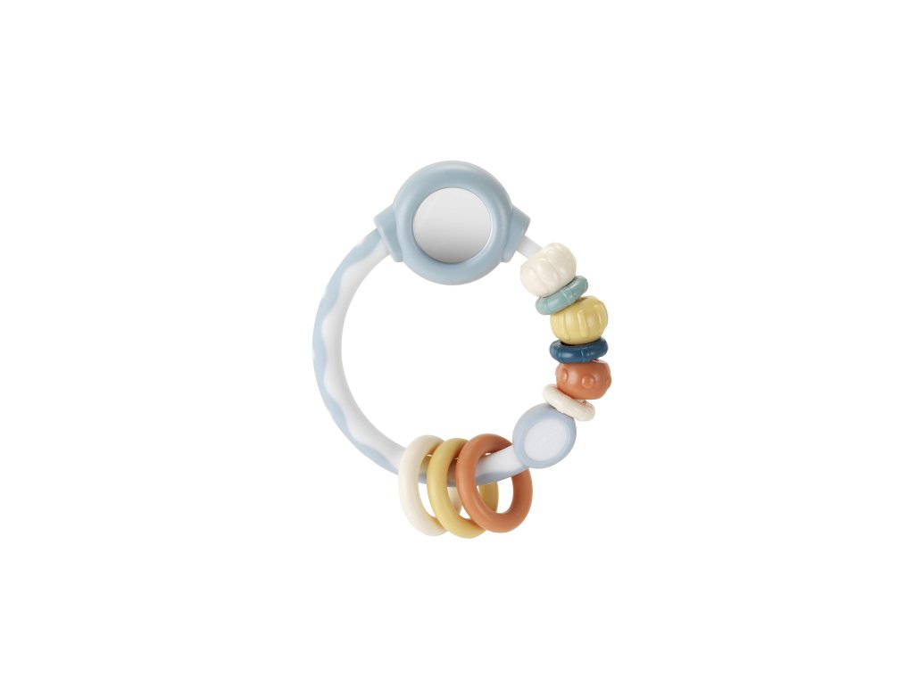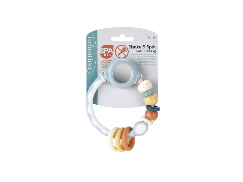 Lehké chrastítko Infantino zabaví vaše miminko doma i na cestách. Barevné kroužky se posouvají a otáčí, různé textury vybízí k prozkoumávání prstíky i v ústech. Nechybí ani bezpečné zrcátko, které přitáhne pozornost miminka. Hračka má tvar pro snadné uchopení malými dětskými ručičkami. Chrastítko podporuje rozvoj jemné motoriky dítěte i jednotlivých smyslů. Vhodné pro děti od narození.