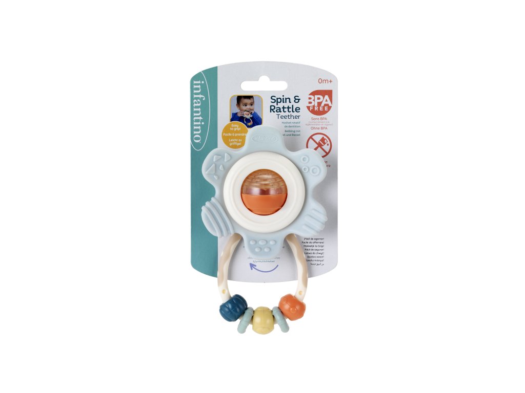 Chrastítko Infantino ve tvaru květiny má tvar pro snadné uchopení. Pozornost dítěte upoutají pohyblivé různobarevné kroužky na rukojeti i chrastící korálky v průhledné kuličce uprostřed hračky. Okvětní plátky květiny slouží jako kousátka, která dítěti pomohou při prořezávání prvních zoubků. Chrastítko podporuje rozvoj jemné motoriky dítěte i jednotlivých smyslů. Vhodné pro děti od narození.