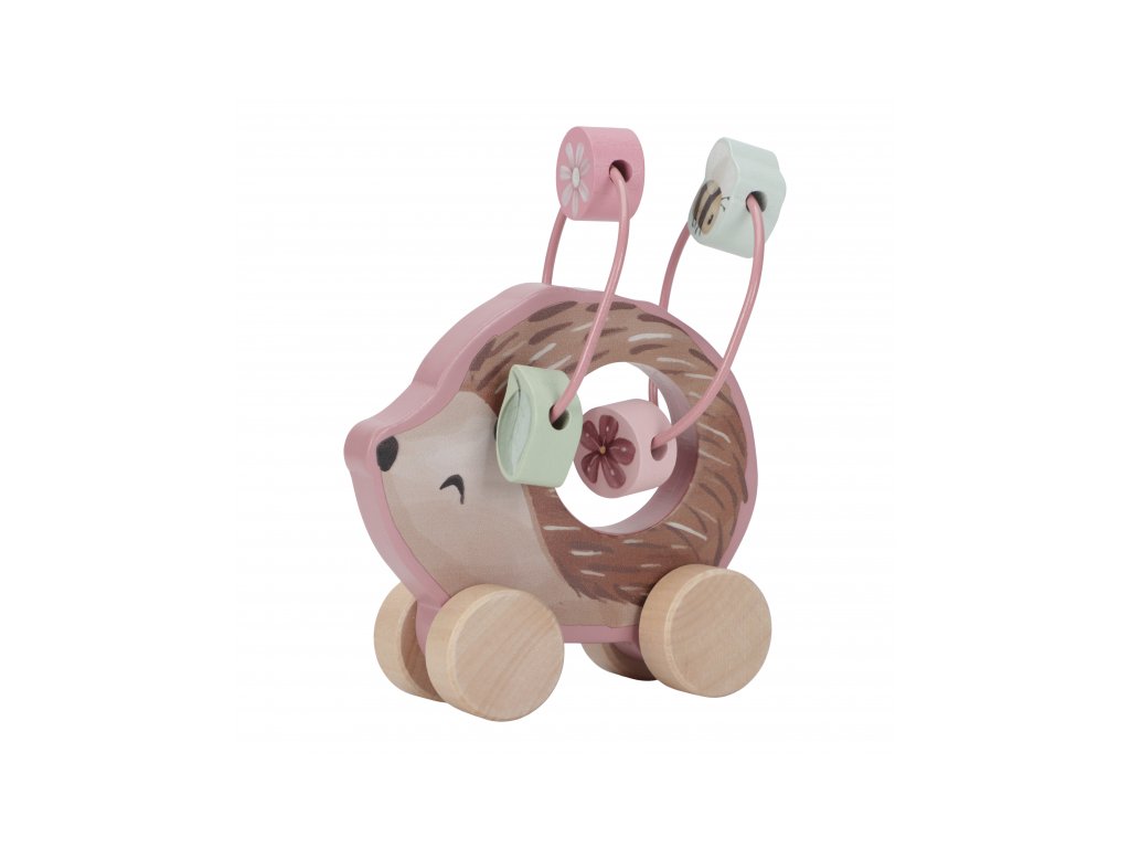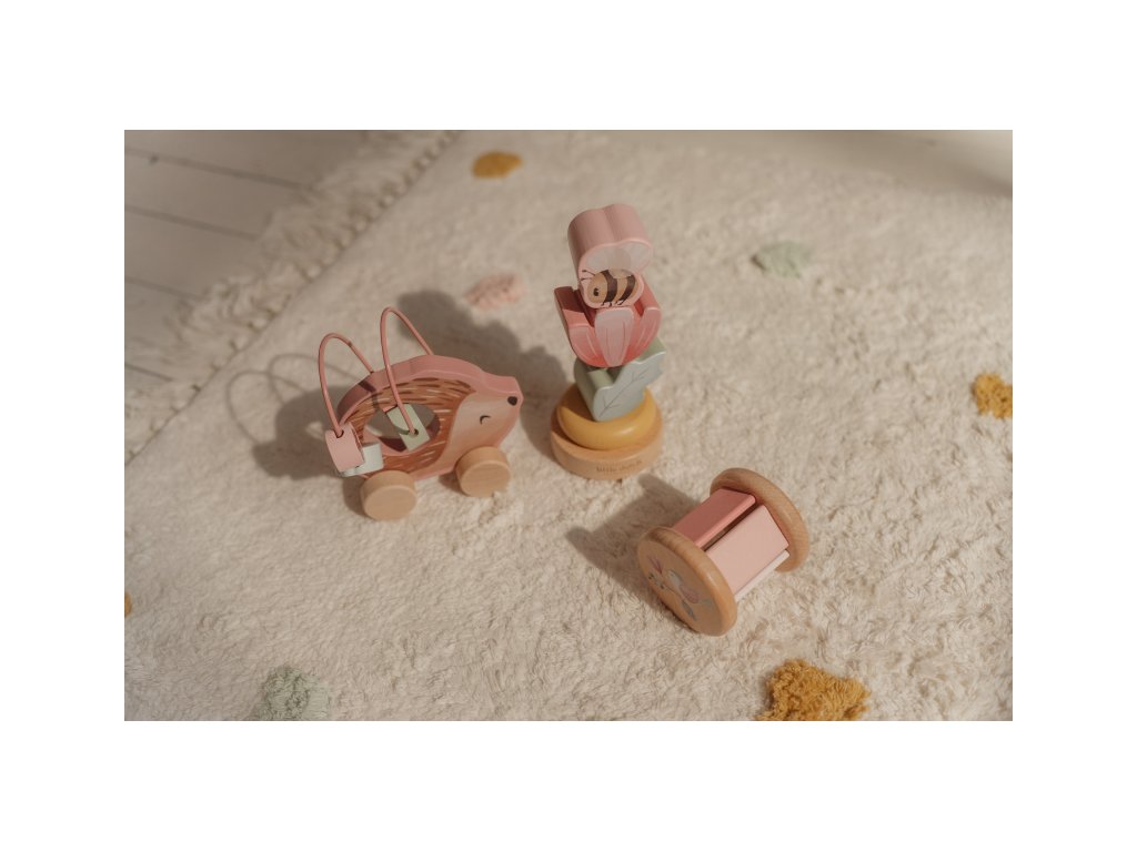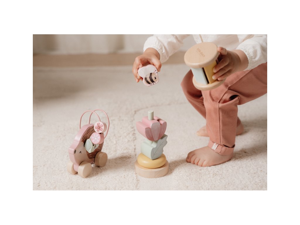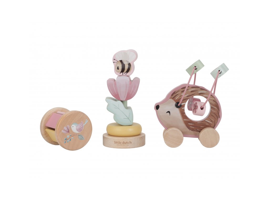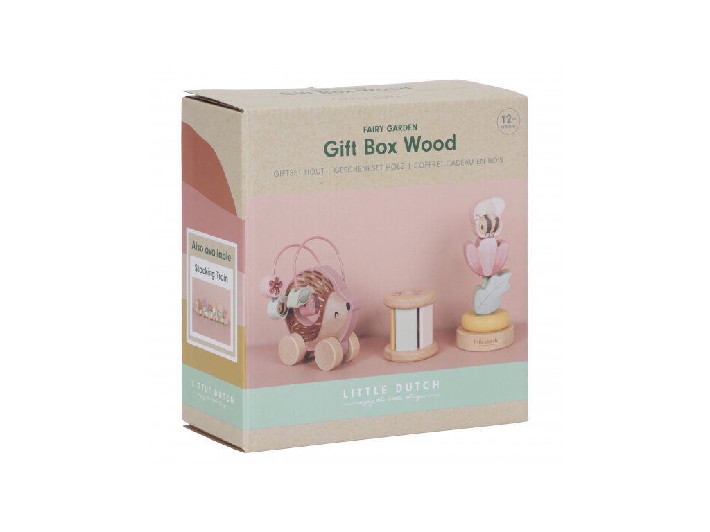 Dárková sada obsahuje tři krásné dřevěné hračky s něžným potiskem motivů ze života na zahradě. Chrastítko ve tvaru válečku při pohybu jemně cinká, skládací květina s včeličkou vybízí k rozložení a znovu složení. Třetí hračkou je roztomilý ježek na kolečkách se spirálou, na které se pohybují dřevěné korálky v podobě kytiček, listu a včelky. Dárkový set je součástí designové kolekce hraček a doplňků Little Dutch Fairy Garden inspirované životem na zahradě. Vyrobeno z dřeva certifikovaného FSC. Rozměry boxu: 21 x 20 x 8,4 cm Vhodné pro děti od 12 měsíců.