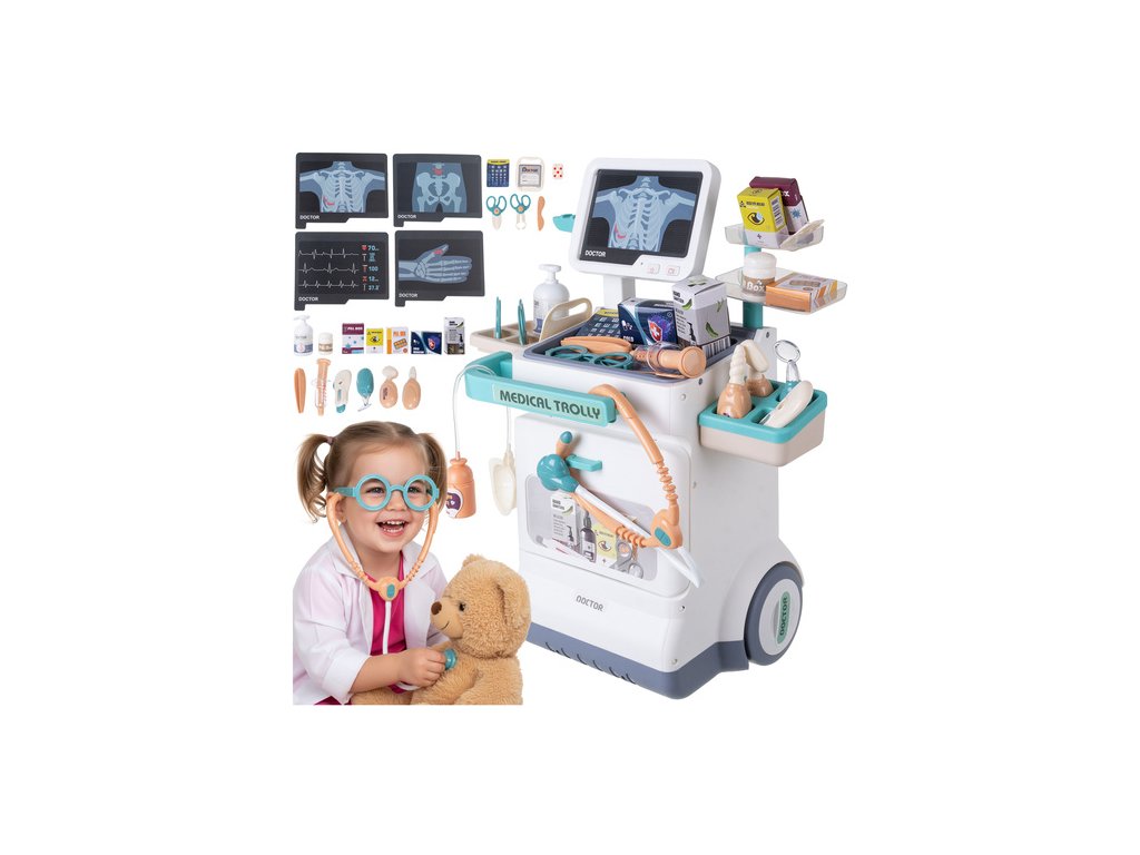 - Skutečná lékařská stanice doma - velký lékařský vozík s EKG a rentgenovým panelem, policemi a světelnými a zvukovými efekty umožňuje dítěti cítit se jako skutečný lékař.