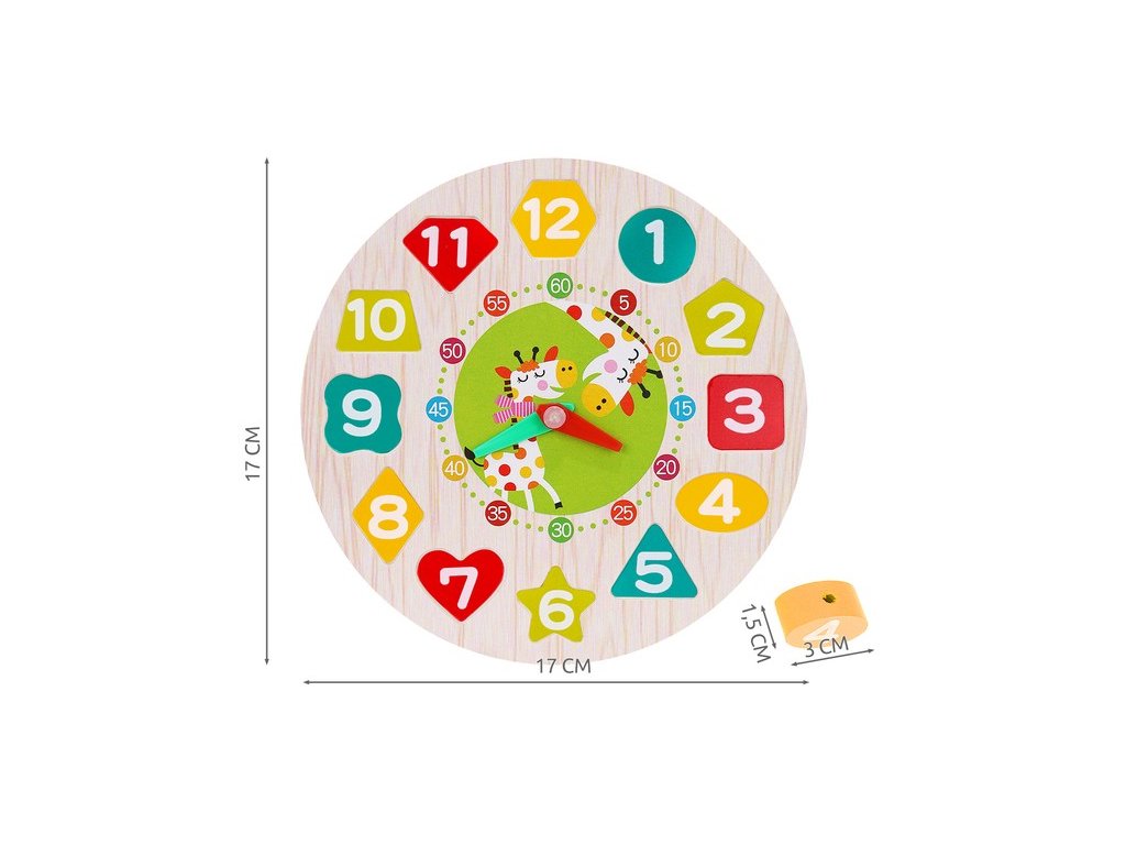Hodiny mají 2 ručičky a ciferník s minutami, což je ideální pro učení celých hodin. Menší dítě si může s hodinami hrát a přizpůsobovat tvary otvorům na ciferníku. Starší dítě se může učit barvy, tvary, čísla a jména v angličtině a poznávat čas na hodinách.