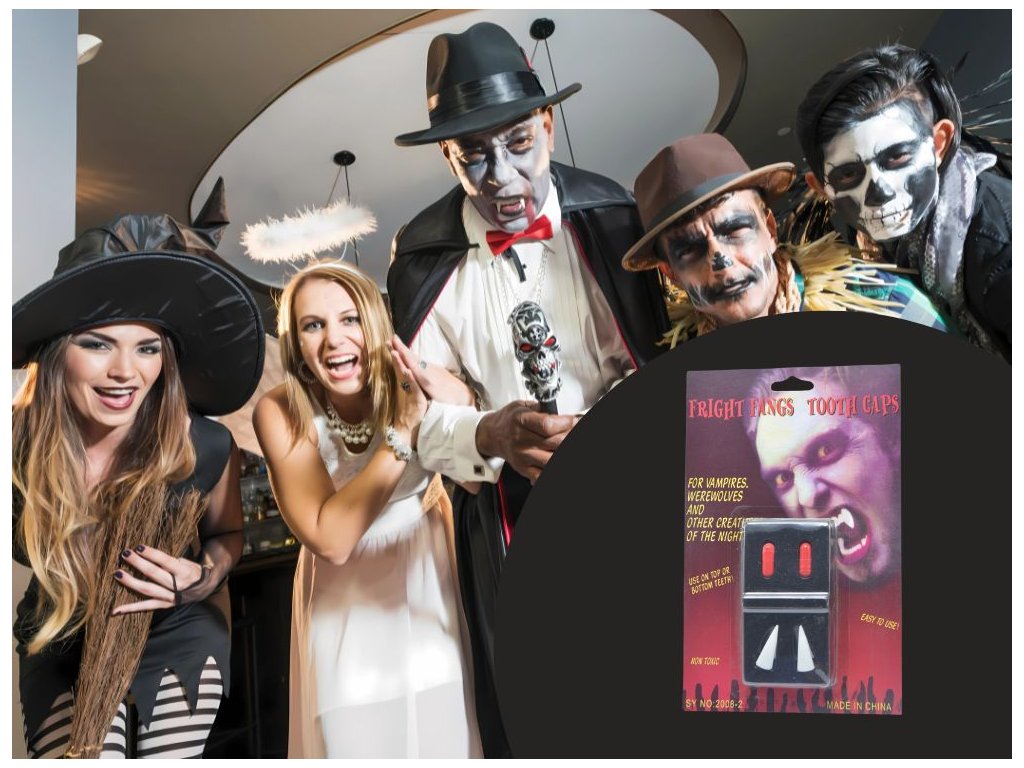 Nebojte se odvážných kousků na tuto Halloween! S našimi falešnými zuby s krví v kapsli se proměníte v upíra nebo vlkodlaka během okamžiku. Nepromeškejte příležitost být originální a zanechat krásný dojem na každého, kdo vás potká. Objednejte si je ještě dnes a připravte se na noční hrůzy!