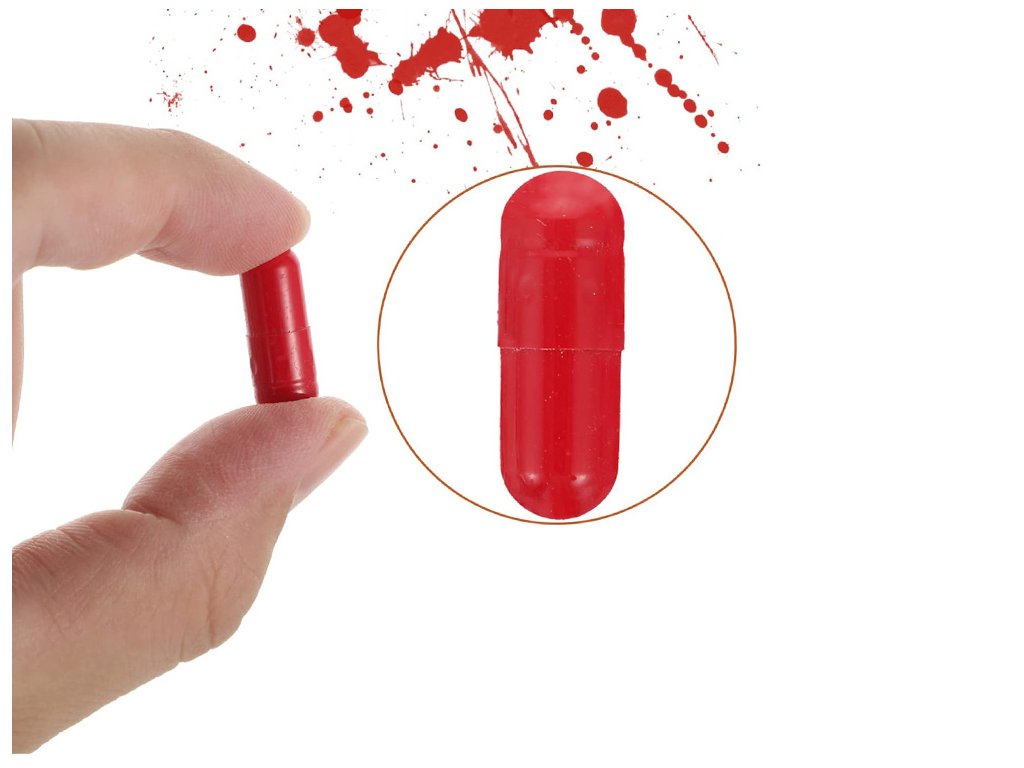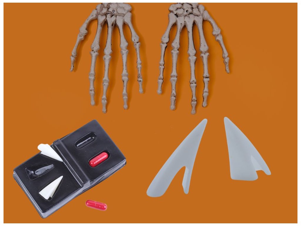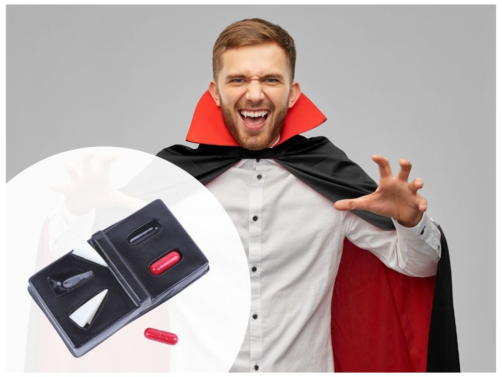 - Krve v kapsli: Součástí balení je kapsle s umělou krví, kterou můžete použít k doladění vašeho vzhledu a dodat mu ještě více autentičnosti.