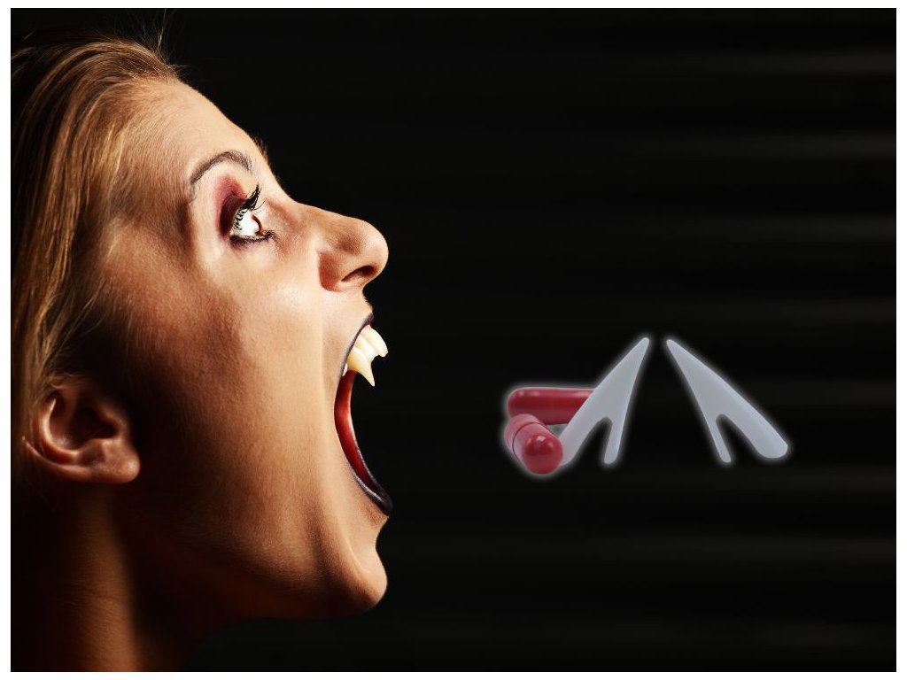 Falešné zuby jsou velmi jednoduché na použití. Stačí je vložit do úst a přizpůsobit je svému chrupu. Kapsli s krví lze snadno otevřít a aplikovat na zuby pro dosažení realistického efektu. Poté, co skončíte s večerem, je můžete jednoduše vyjmout a uschovat pro další použití.