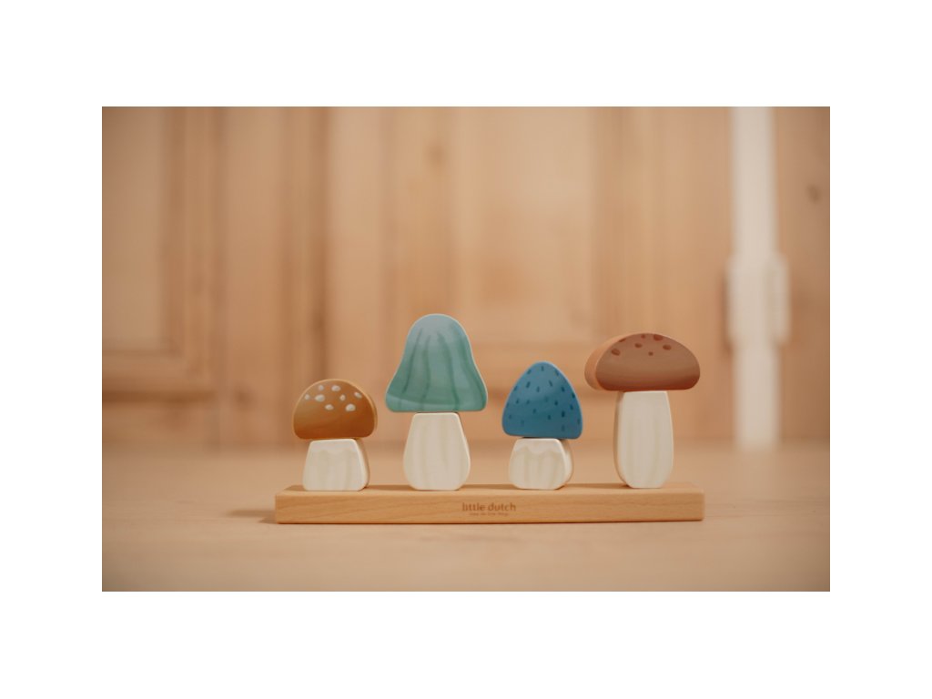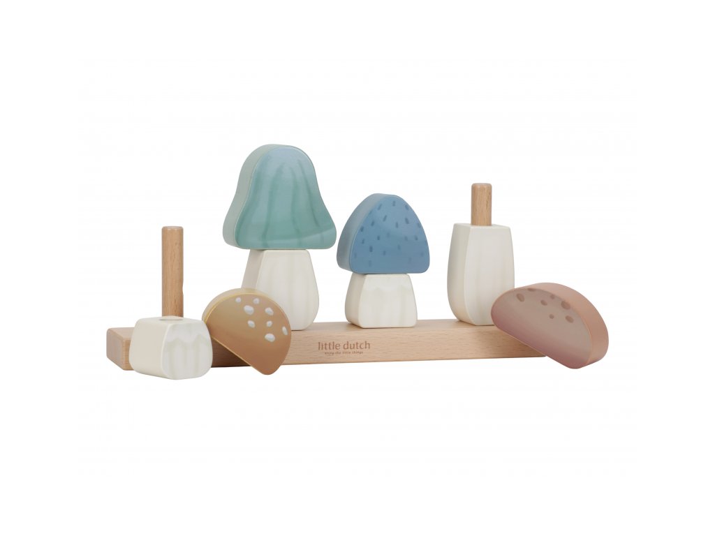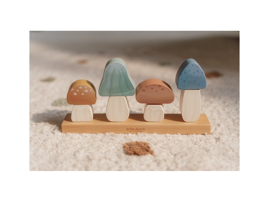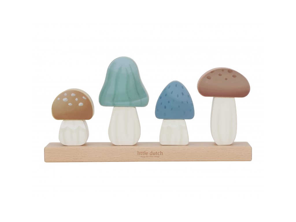 Krásné dřevěné houby jsou tvořeny dvěma díly - kloboučkem a nohou, které se postupně navlékají na stonek na základně. Kloboučky a nohy jsou libovolně kombinovatelné a je tak možné tvořit pokaždé jiné varianty houbiček. Hračka pomáhá rozvíjet jemnou motoriku dítěte a může sloužit i jako krásná dekorace v dětském pokoji. Hračka je součástí designové kolekce hraček Little Dutch Forest Friends inspirované životem v lese. Vyrobeno z dřeva certifikovaného FSC. Rozměry: 24,6 x 5 x 13 cm Vhodné pro děti od 12 měsíců.