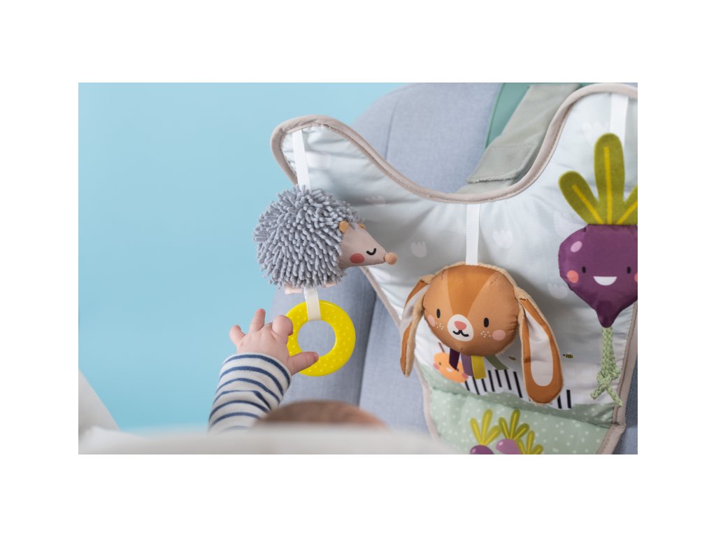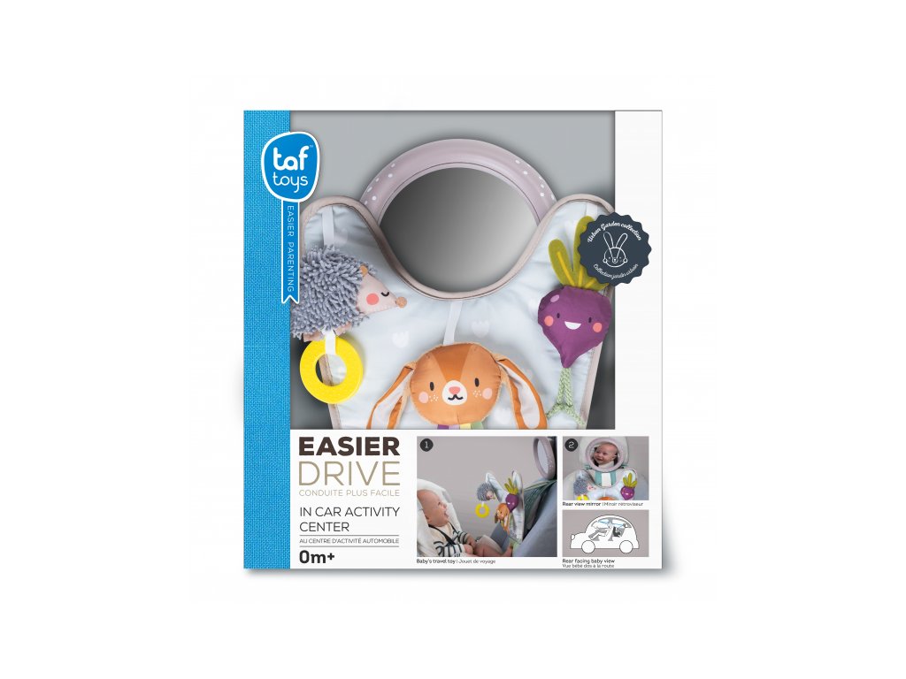 Hrací pultík se zavěšenými textilními hračkami a krásnými ilustracemi ze života na zahradě zabaví během jízdy dítě sedící v autosedačce proti směru jízdy. Velké zpětné zrcátko umožňuje rodiči dítě sledovat během jízdy. Pultík nabízí ke zkoumání chrasticího králíčka, šusticí řepu a cinkajícího ježka. Snadné připevnění do auta s pomocí suchého zipu. Hrací pultík a zpětné zrcátko lze používat i samostatně. Pro děti od narození.