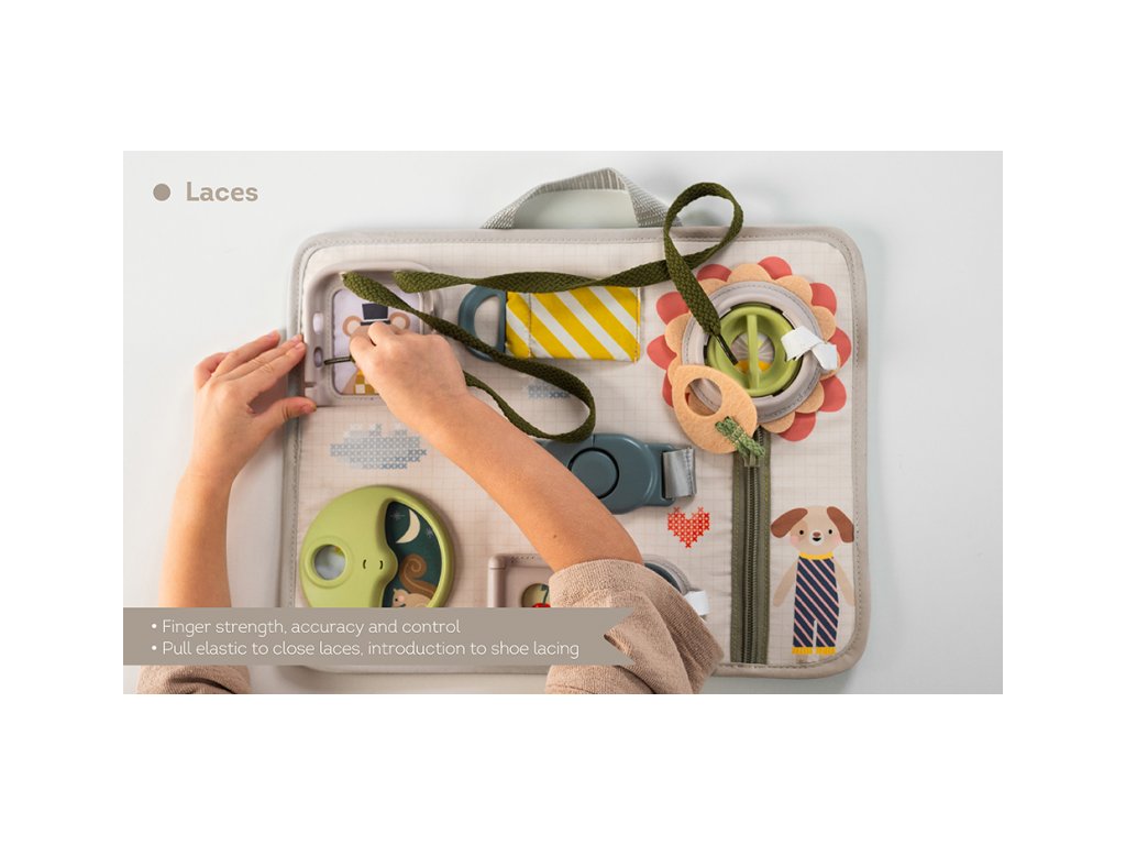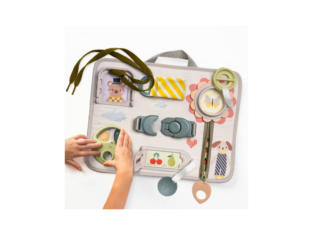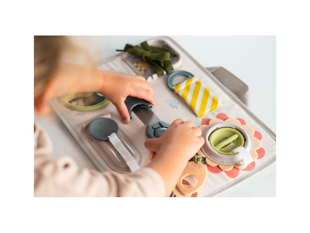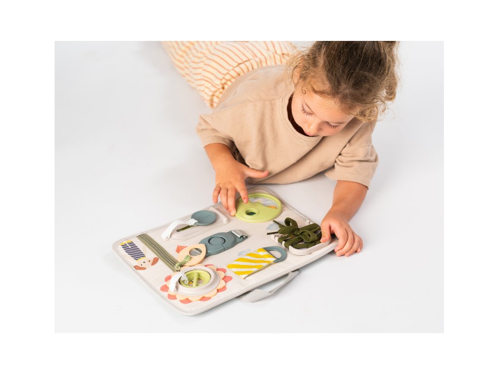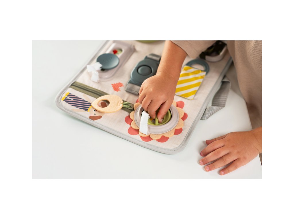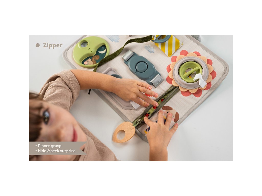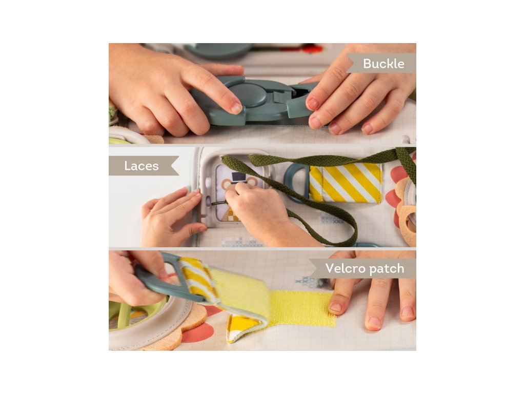 Originální hrací pult nabízí množství různorodých aktivit, mezi kterými najdete zip, velký knoflík, suché zipy tkaničky, přezku, poutko a mnoho dalšího. Zapínáním a rozepínáním si děti procvičují jemnou motoriku i koordinaci oko-ruka. Aktivity zároveň podporují rozvoj kreativity dítěte i jeho schopnosti řešit problémy. Hrací pult byl speciálně navržen pro děti od 18 měsíců. Rozměry: 34 x 25 cm