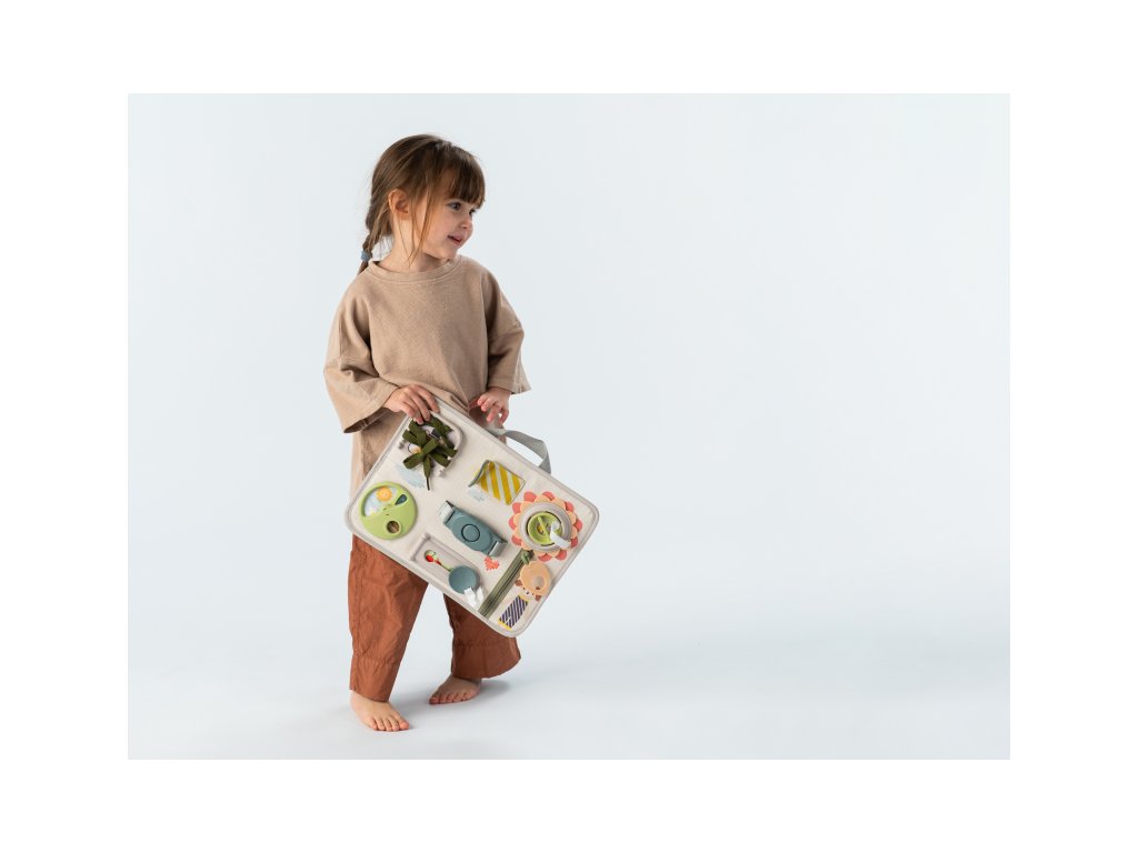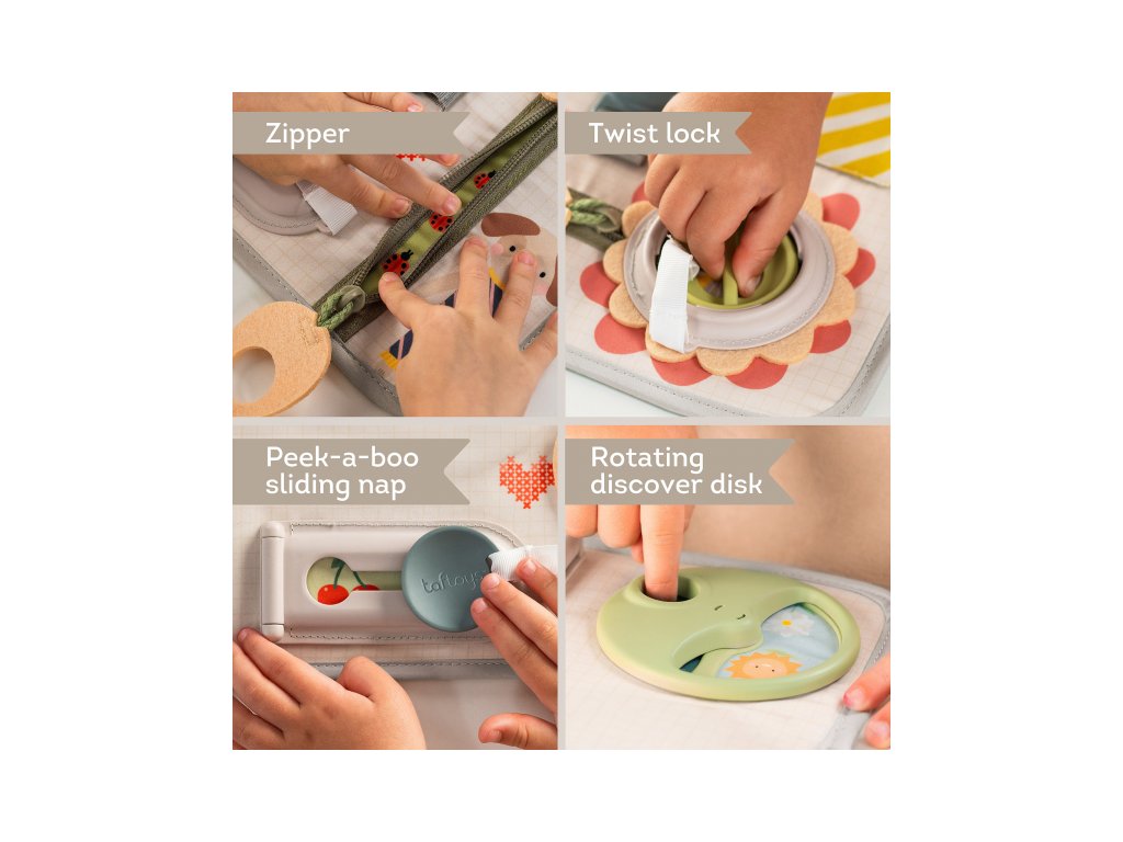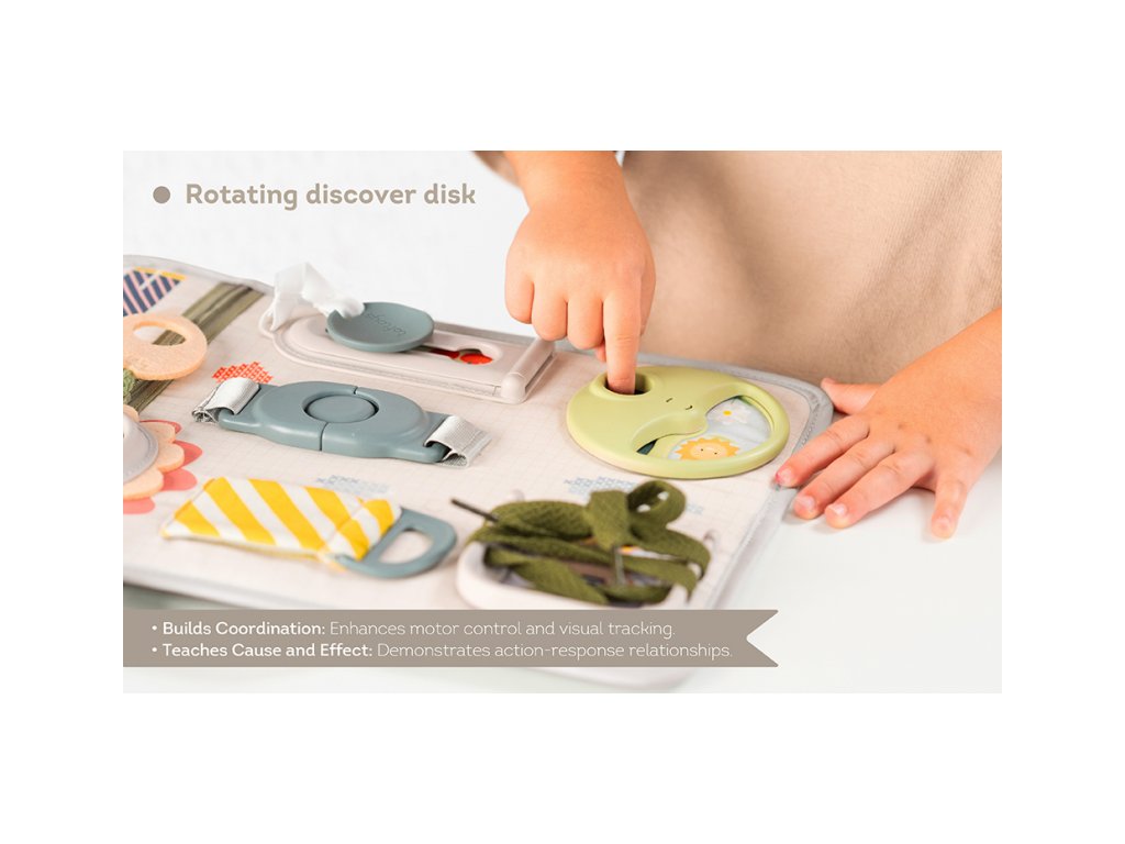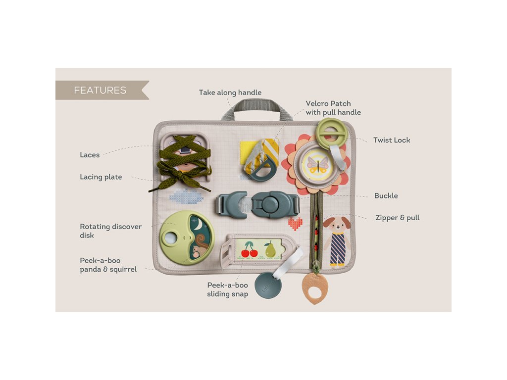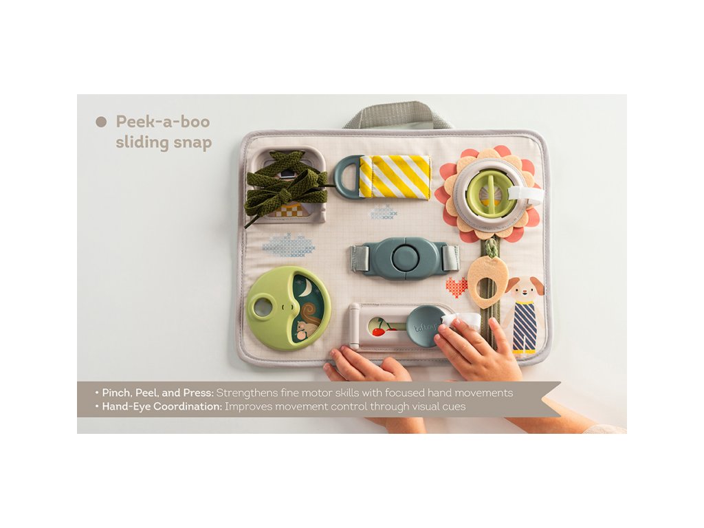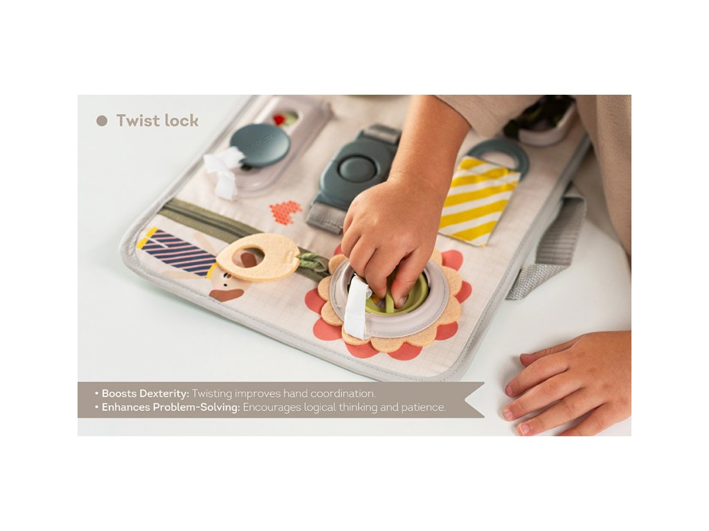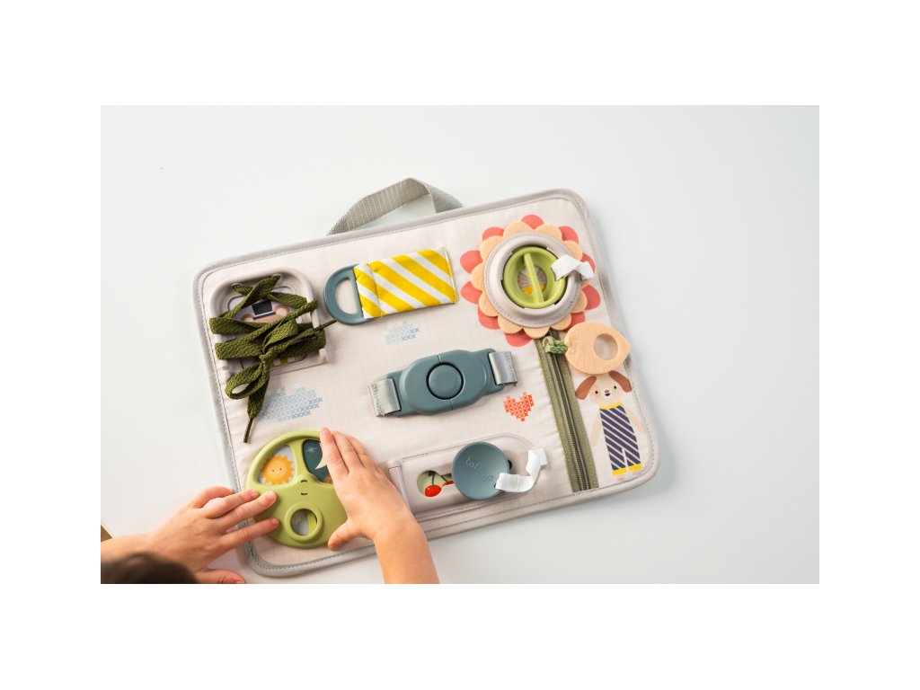 Originální hrací pult nabízí množství různorodých aktivit, mezi kterými najdete zip, velký knoflík, suché zipy tkaničky, přezku, poutko a mnoho dalšího. Zapínáním a rozepínáním si děti procvičují jemnou motoriku i koordinaci oko-ruka. Aktivity zároveň podporují rozvoj kreativity dítěte i jeho schopnosti řešit problémy. Hrací pult byl speciálně navržen pro děti od 18 měsíců. Rozměry: 34 x 25 cm