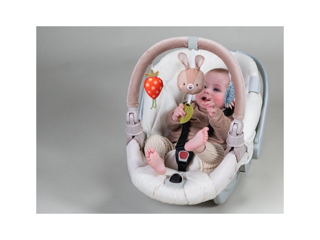 Hudební hrazda určená k připevnění na kočárek nebo autosedačku zabaví vaše miminko na cestách. Snadno ji s pomocí flexibilních plastových klipsů připevníte k většině kočárků i autosedaček. Pozornost dítěte upoutá králíček, který po lehkém doteku hraje melodii, chrasticí ježek i cinkající jahůdka. Hračka rozvíjí motoriku a učí vztahu příčiny a následku. Baterie 3xLR44 jsou součástí. Vhodné od narození.