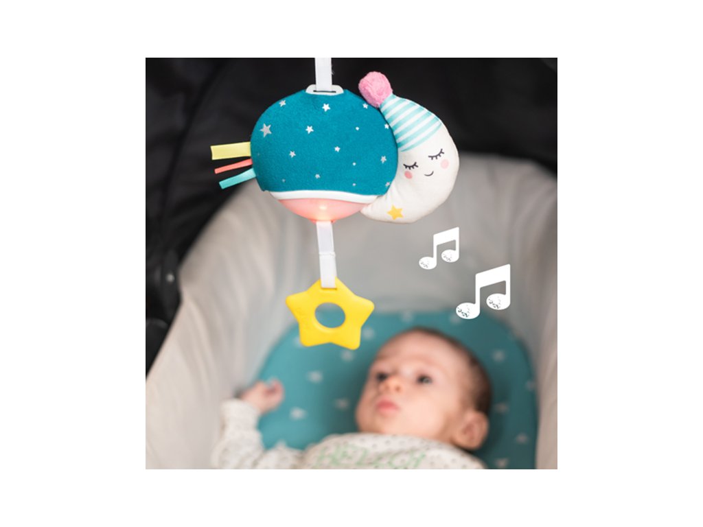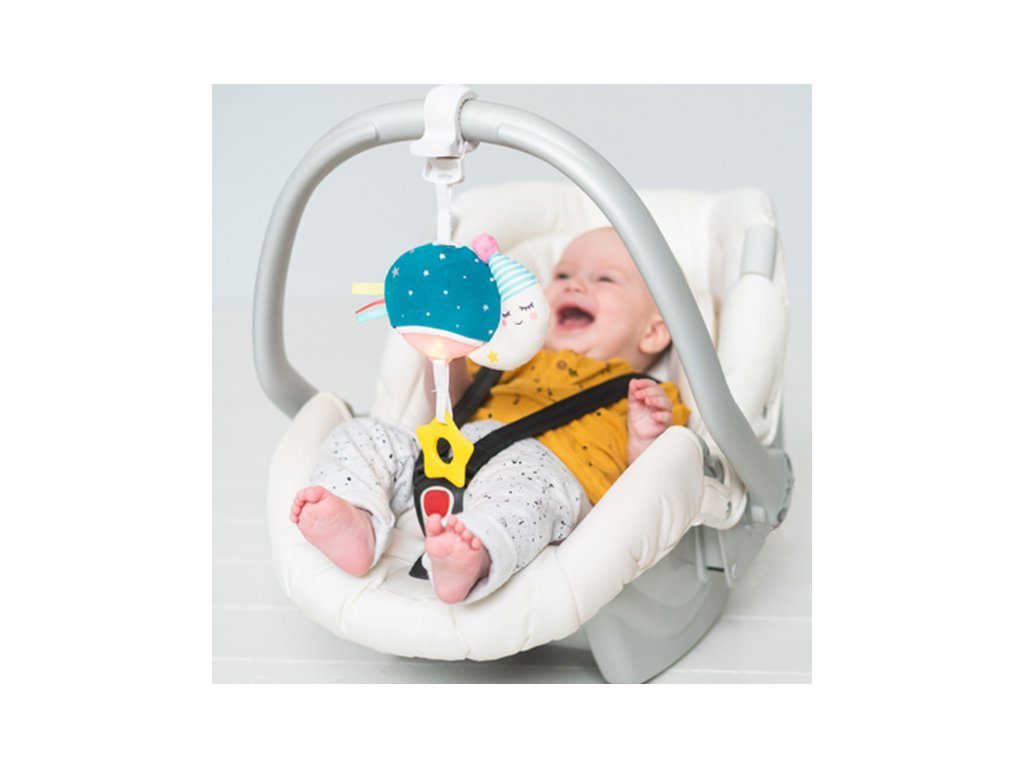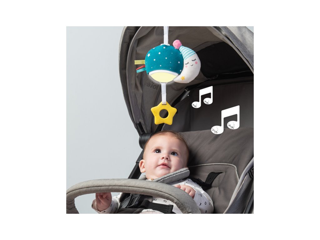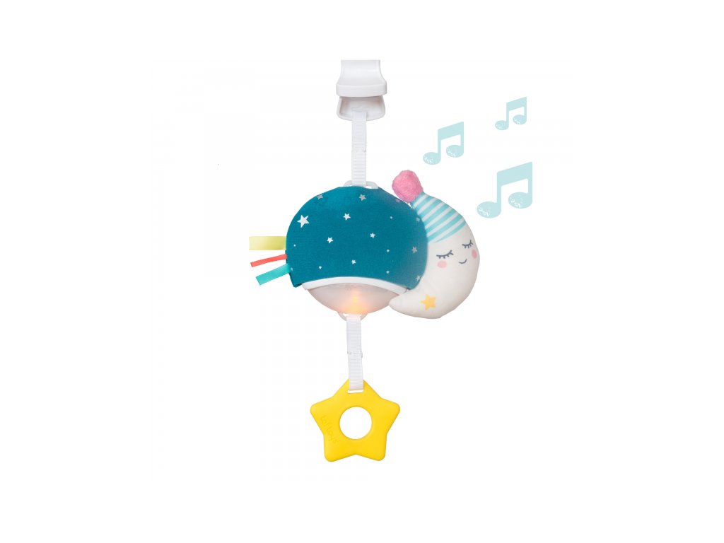 Závěsný hudební box se světýlkem zabaví vaše miminko doma i na cestách. Hudbu se světýlkem dítě samo aktivuje zatáhnutím za kousátko. Hračka hraje tři veselé melodie a uklidňující zvuky v celkové délce 20 minut, jemné světýlko během hraní mění barvy. Kompaktní a lehkou hračku snadno přibalíte s sebou na procházky i výlety. Praktický plastový klip umožňuje rychlé připevnění na kočárek, autosedačku či postýlku. Vhodné pro děti od narození.