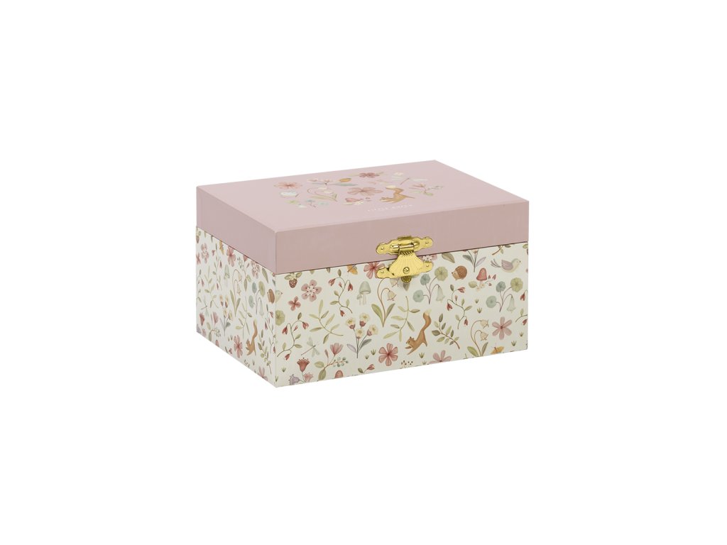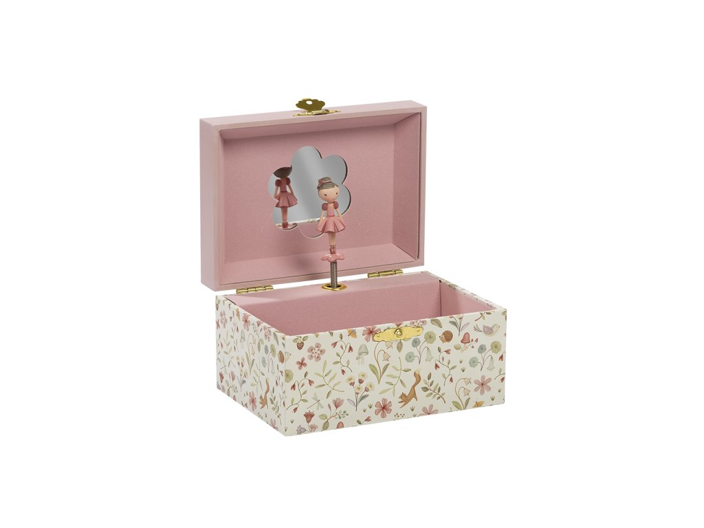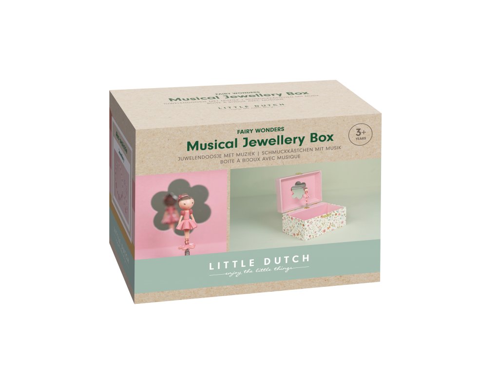 Krásná šperkovnice se zrcátkem a hudebním boxem, který po natažení hraje něžnou melodii. Vaše malá parádnice si do šperkovnice s potiskem květin může ukládat své šperky a jiné vzácné drobnosti. Šperkovnice je součástí designové kolekce hraček a doplňků Little Dutch Fairy Garden inspirované životem na zahradě. Rozměry: 8,5 x 11,5 x 15 cm Vhodné pro děti od 3 let.