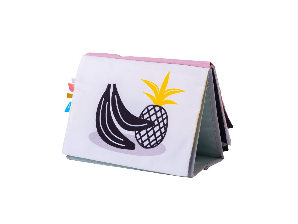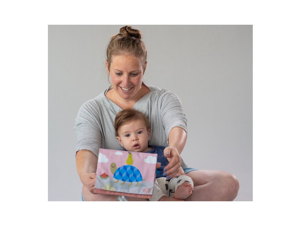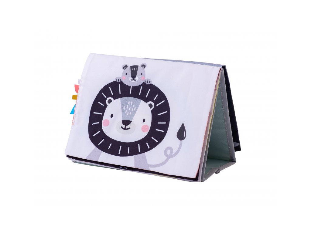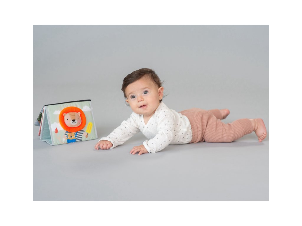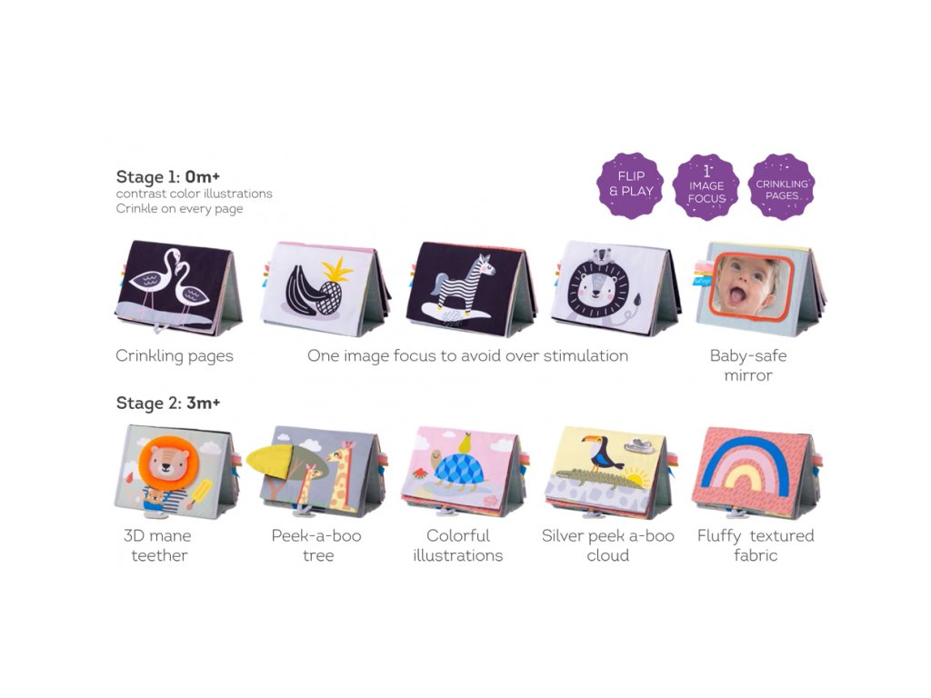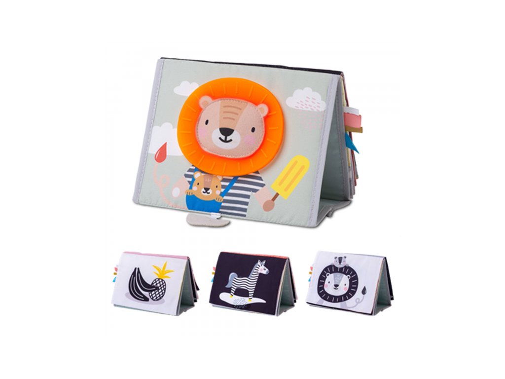 Textilní knížka s otáčecími šustícími stránkami ve tvaru stolního kalendáře nabízí množství neodolatelných obrázků s různorodými texturami, bezpečným zrcátkem, kousátkem apod. Ideální pro postavení před dítě při hře na bříšku. Knížka nabízí dva typy obrázků pro dvě vývojová stádia dítěte: 0-3 měsíce: stránky s bezpečným zrcátkem a vysoce kontrastními jednoduchými obrázky, které podněcují rozvoj smyslů a emoční inteligence dítěte. Od 3 měsíců: strana s barevnými obrázky a různorodými texturami ke zkoumání, které podporují rozvoj smyslů a jemné motoriky dítěte. Rozměry: 20,5 x 19,5 cm Vhodné pro děti od narození.