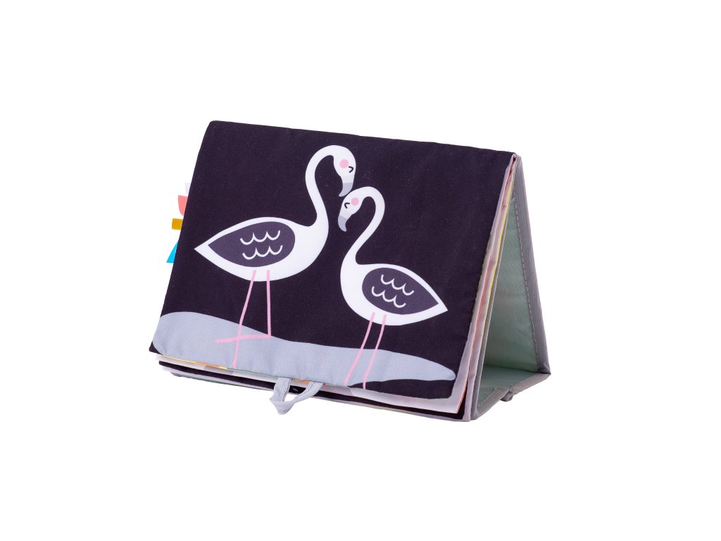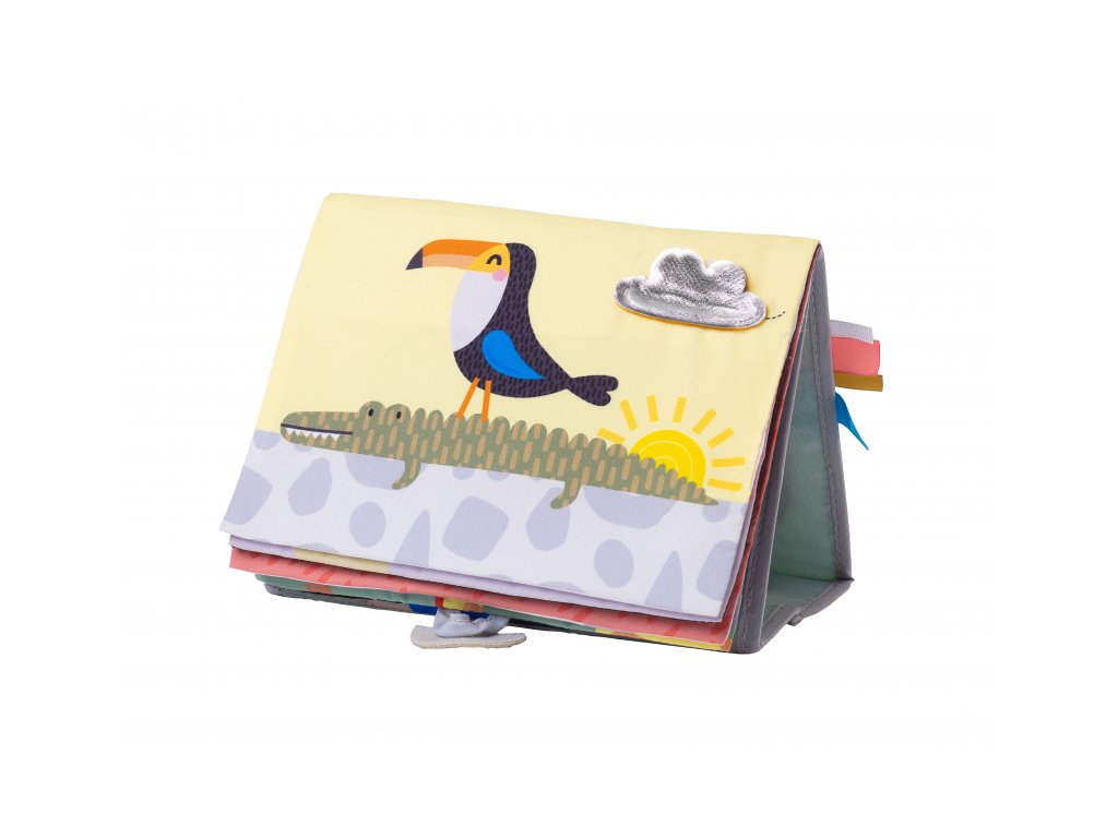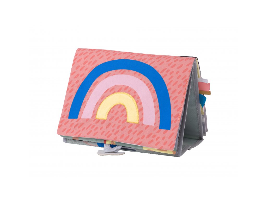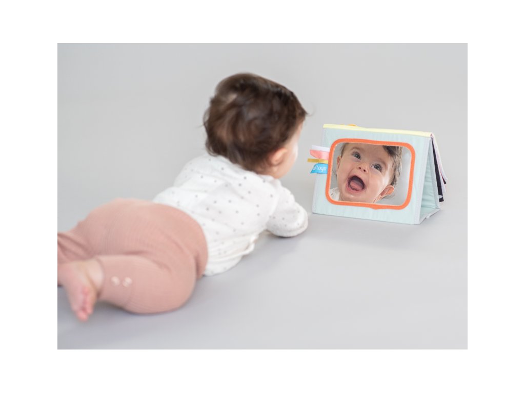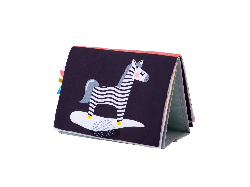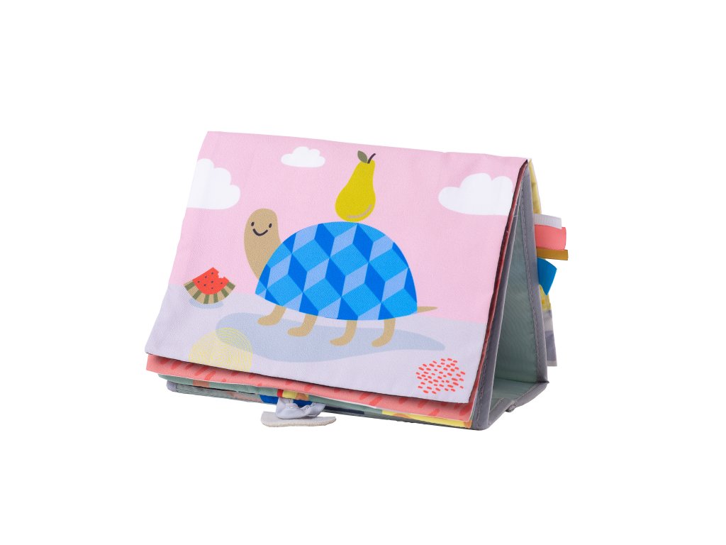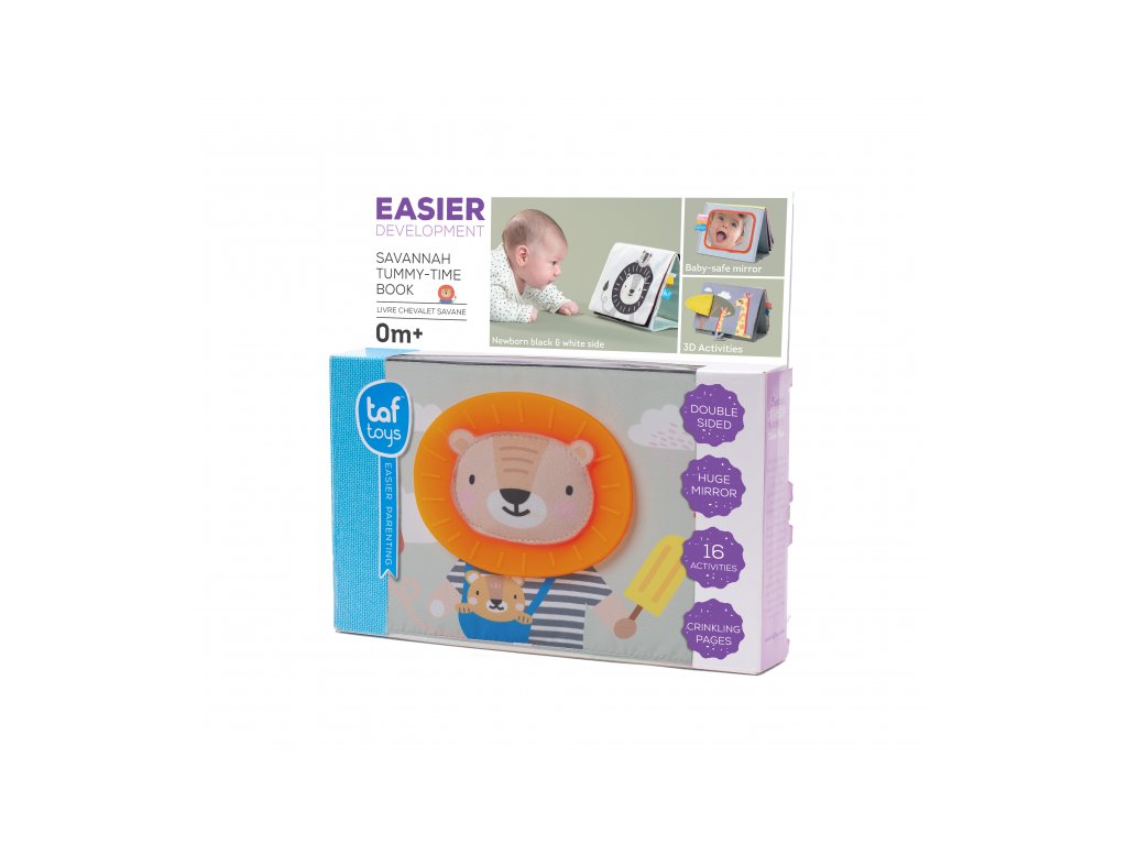 Textilní knížka s otáčecími šustícími stránkami ve tvaru stolního kalendáře nabízí množství neodolatelných obrázků s různorodými texturami, bezpečným zrcátkem, kousátkem apod. Ideální pro postavení před dítě při hře na bříšku. Knížka nabízí dva typy obrázků pro dvě vývojová stádia dítěte: 0-3 měsíce: stránky s bezpečným zrcátkem a vysoce kontrastními jednoduchými obrázky, které podněcují rozvoj smyslů a emoční inteligence dítěte. Od 3 měsíců: strana s barevnými obrázky a různorodými texturami ke zkoumání, které podporují rozvoj smyslů a jemné motoriky dítěte. Rozměry: 20,5 x 19,5 cm Vhodné pro děti od narození.