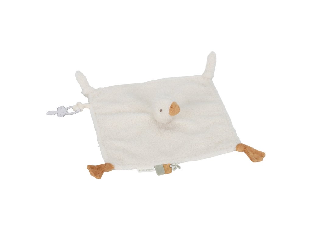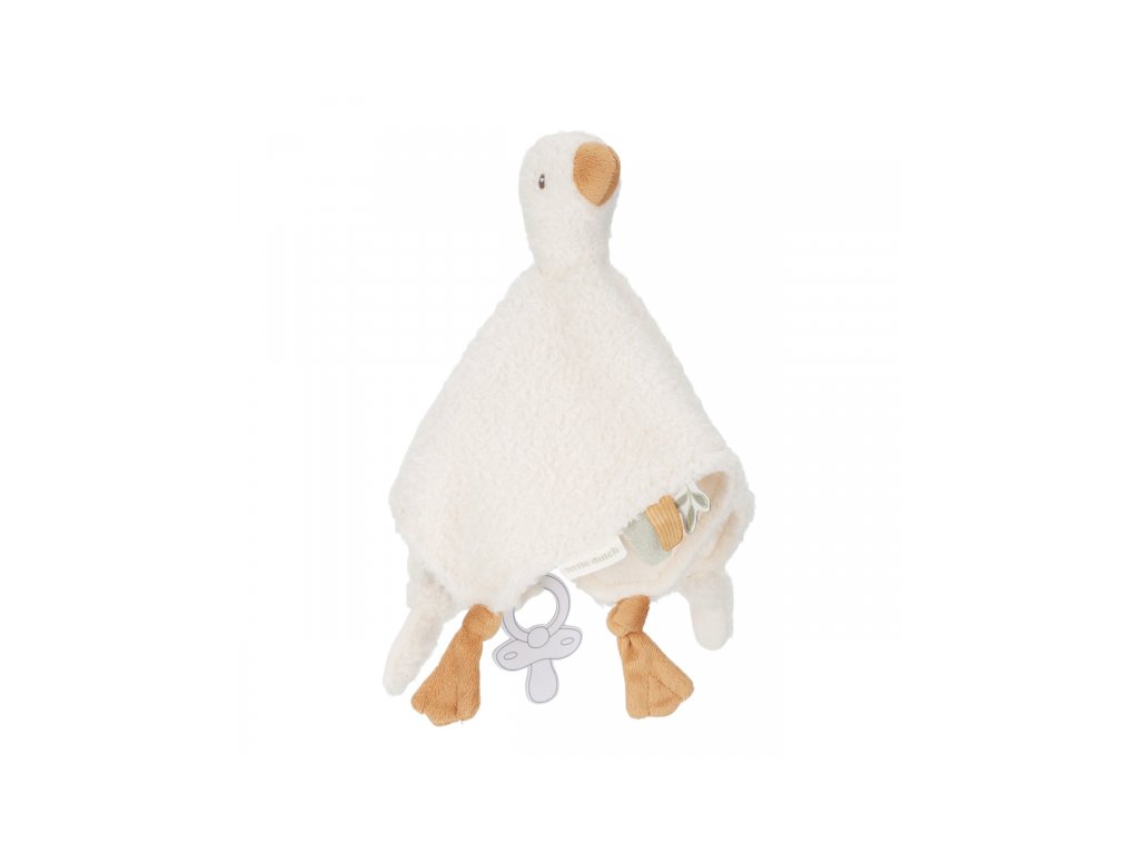 Plyšová hračka ve tvaru husy z jemného materiálu chrastí a nabízí různorodé aktivity. Je součástí kolekce Little Dutch Newborn Naturals a je vhodná pro děti od narození.