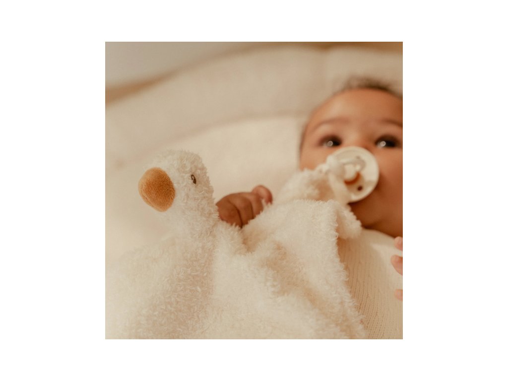 Plyšový muchláček s roztomilou husou a úchytem pro šidítko láká ke hraní i mazlení. Muchláček je je vyroben z velmi jemného a příjemného materiálu a je ideální jako společník do postýlky pro klidné usínání. Hračka je součástí designové kolekce hraček Little Dutch Newborn Naturals. Rozměry: 24 x 24 cm Složení: 100% polyester Výplň je vyrobena ze 100% recyklovaného polyesteru s certifikací GRS (Global Recycled Standard). Vhodné pro děti od narození.