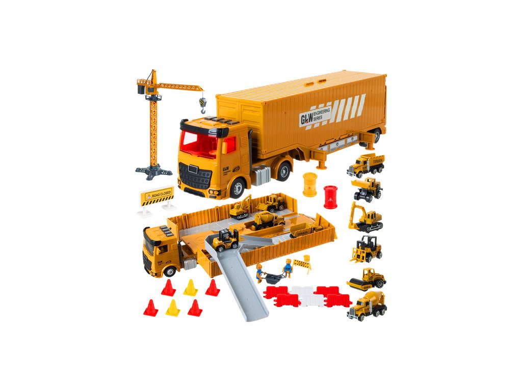 Představujeme unikátní sadu, která se rychle promění ve skutečné staveniště! Stabilní mobilní jeřáb s kovovým protizávažím přepravuje materiál přesně tam, kam je potřeba. Sada obsahuje velký nákladní automobil s výsuvnou plošinou, míchačku betonu, válec, vysokozdvižný vozík, pásový bagr, nakladač, sklápěč a příslušenství, jako jsou kužely, sudy a výstražné zábrany. Tato hračka zaručuje hodiny kreativního a bezpečného hraní – ideální pro malé fanoušky stavebních strojů!
