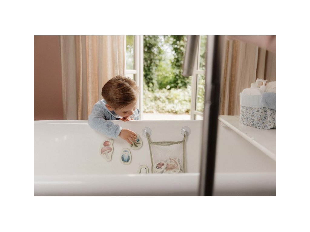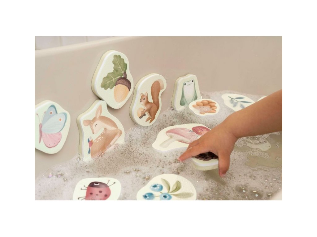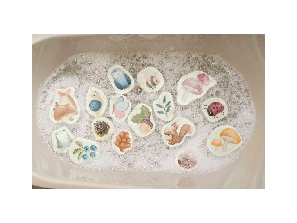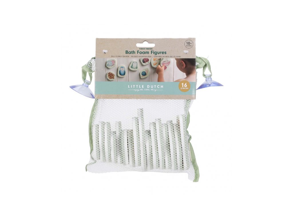 Pěnové samolepky do vany s natištěnými motivy ze života v lese zabaví vaše děti při koupání ve vaně. Samolepky stačí namočit a přitisknout je na vanu. Po koupeli je snadno uložíte do síťovinového sáčku s přísavkami, který je součástí výrobku. Hračka je součástí designové kolekce hraček a doplňků Little Dutch Forest Friends inspirované životem v lese. Balení obsahuje 16 samolepek. Vhodné pro děti od 10 měsíců.