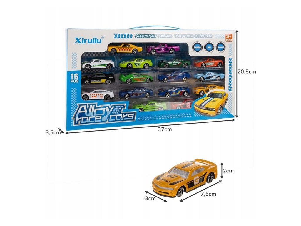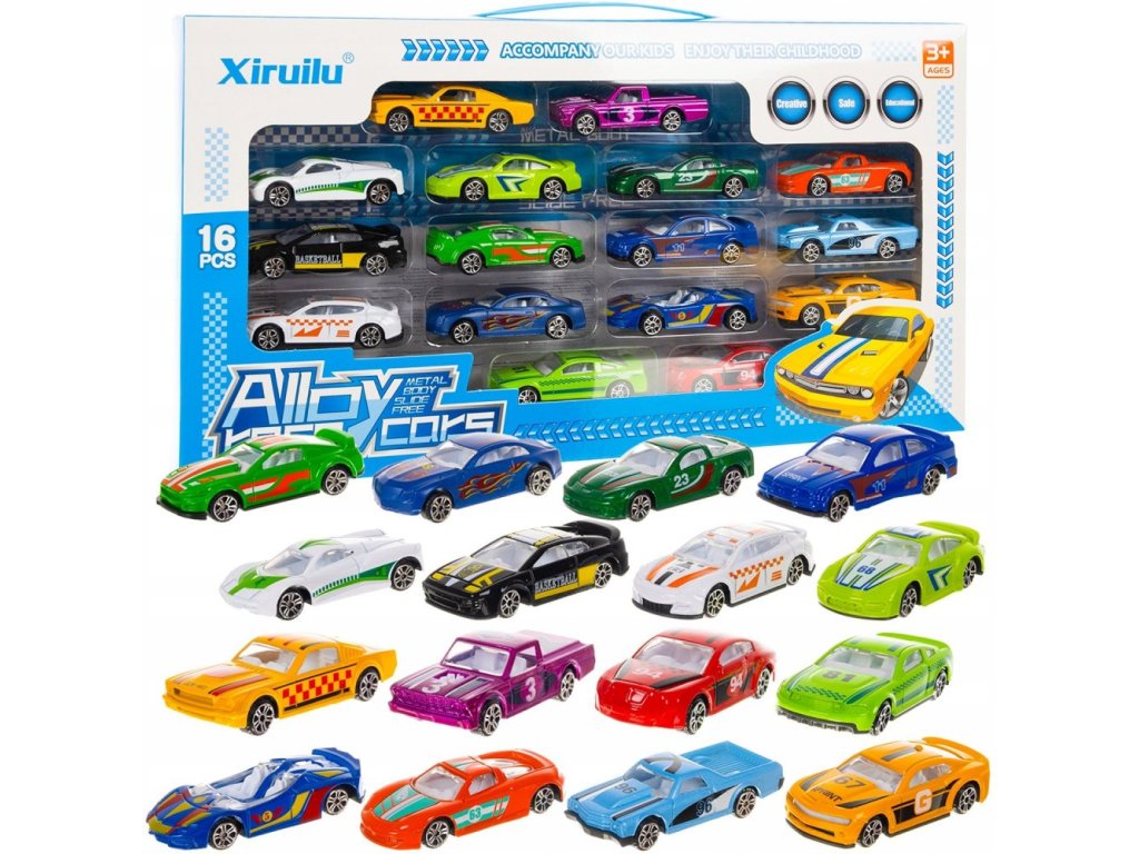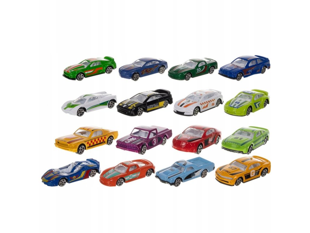 Sada obsahuje 16 barevných autíček vyrobených z kovu, která zahrnují: