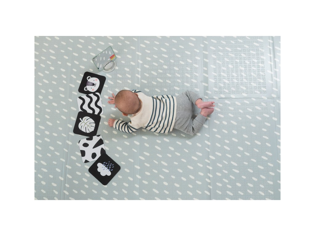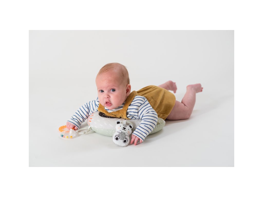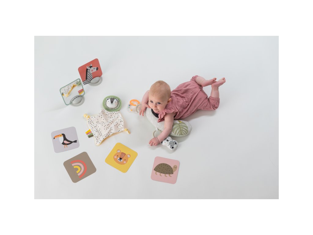 Dárkový box obsahuje speciálně navrženou sadu hraček pro novorozence, které zabaví dítě při hře na bříšku a podporují rozvoj jednotlivých smyslů a motorických dovedností dítěte. Hračky současně pomáhají rozvíjet emoční inteligenci dítěte. Polštářek z měkkého, příjemného materiálu je speciálně navržený, aby podporoval hraní dítěte na bříšku. Sada vysoce kontrastních obrázků a bezpečného zrcátka se dvěma stojánky je rovněž určena pro postavení před dítě v poloze na bříšku. Množství obrázků, které sada nabízí, umožňuje rodičům obrázky vyměňovat a udržovat tak déle pozornost dítěte. K polštářku je možné připevnit i chrastítko s kousátkem a šusticí textilní hračku v podobě roztomilého lvíčete. Pro malého kojence, který tráví většinu dne i noci ležením na zádech, je důležité, aby trávil několikrát denně čas ležením na bříšku a takzvaným “pasením koníčků”. Poloha na bříšku přináší děťátku jiný pohled na svět a posiluje krční a zádové svaly, které později umožňují dítěti začít se přetáčet, lézt a sedět bez opory. Obsah balení: polštářek pro hru na bříšku bezpečné zrcátko muchláček Lvíček chrastítko s kousátkem šusticí lvíče 5 oboustranných karet s 10 kontrastními ilustracemi 2 plastové stojánky na karty Rozměry boxu: 35 x 26 x 6 cm Vhodné pro děti od narození.