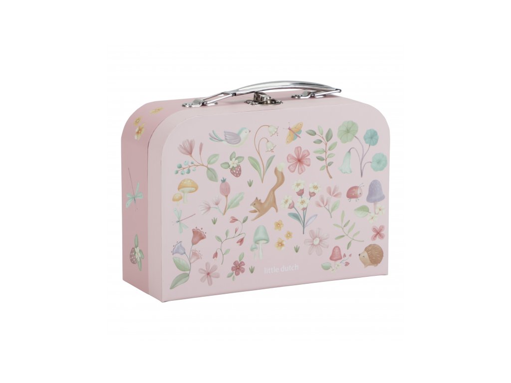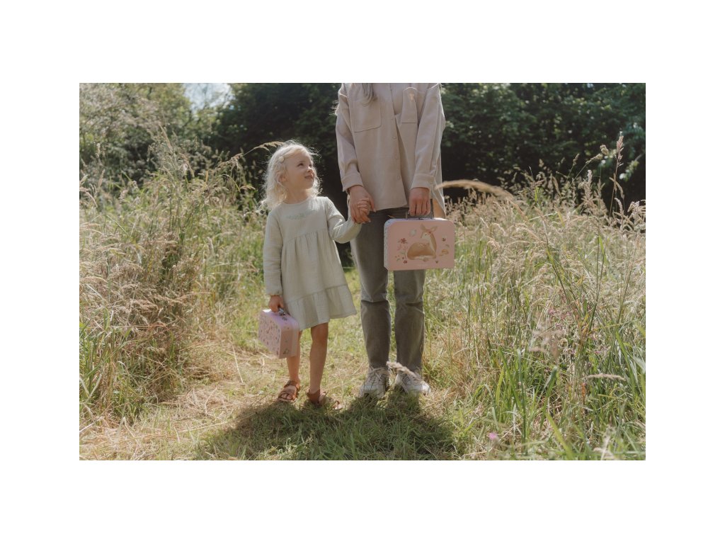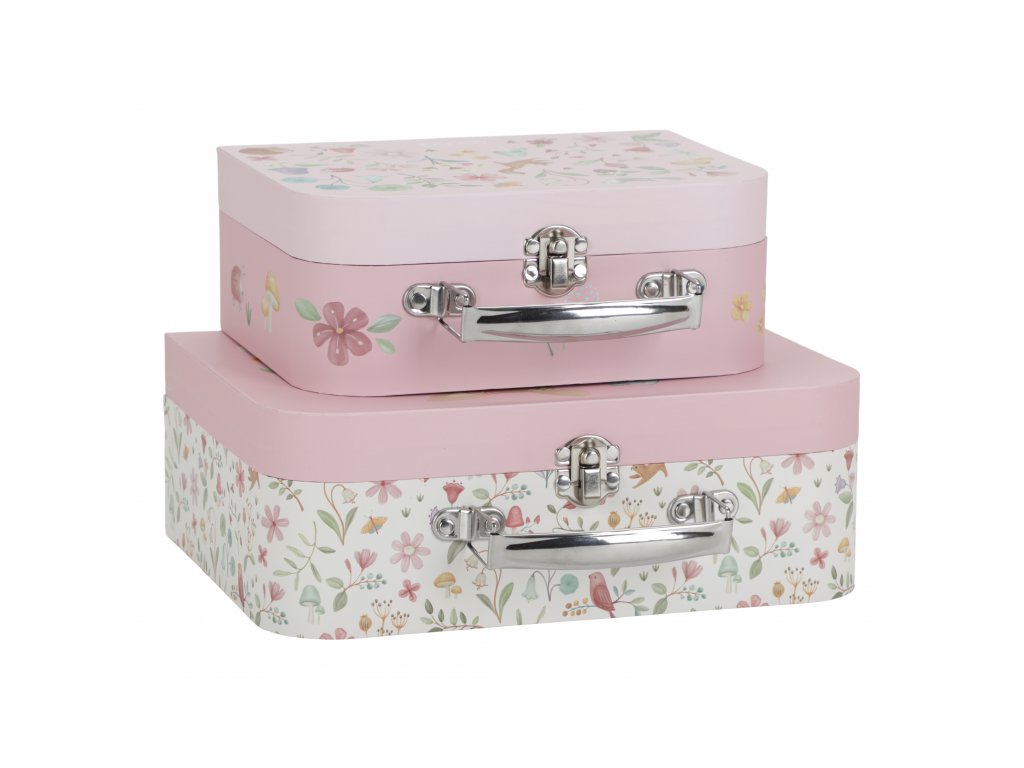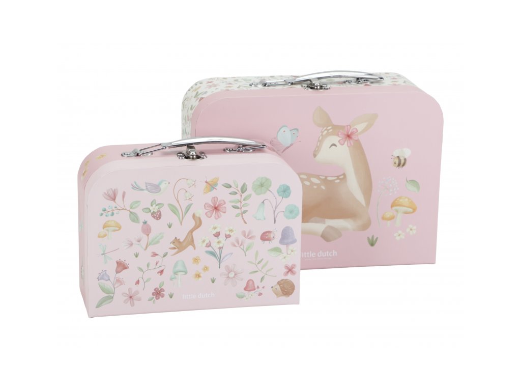 Sada klasických dětských kufříků v kvalitním provedení s krásným potiskem motivů ze života na zahradě. Sadu tvoří dva kufříky, menší kufřík má velikost, která se vejde do většího kufříku pro úsporu místa při skladování. Oba kufříky mají klasické kovové madlo pro snadné přenášení a zámek pro bezpečné uzavření obsahu. Kufříky jsou ideální pro ukládání drobných hraček, výtvarných potřeb apod. a budou sloužit i jako krásná dekorace v dětském pokoji. Sada je součástí designové kolekce hraček a doplňků Little Dutch Fairy Garden inspirované životem na zahradě. Rozměry většího kufříku: 25 x 20 x 8,9 cm Vhodné pro děti od 2 let.
